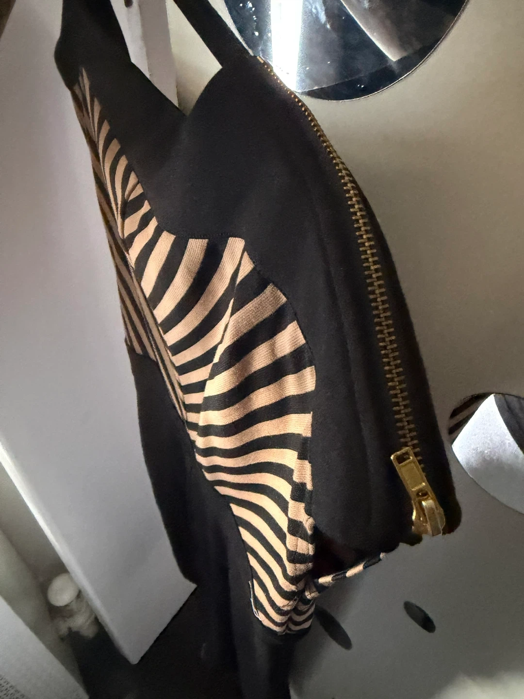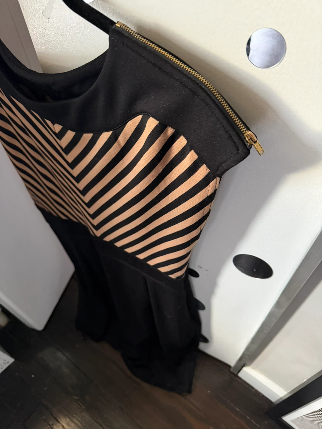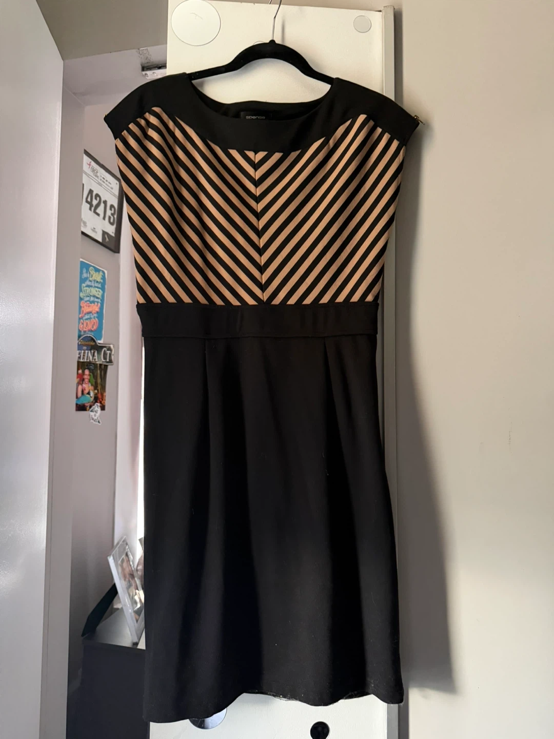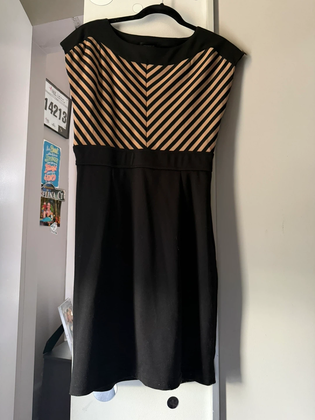 Selling a cute black and beige striped dress! It has a unique zipper detail on the shoulder. It's in great condition and ready for a new owner. Size 8.