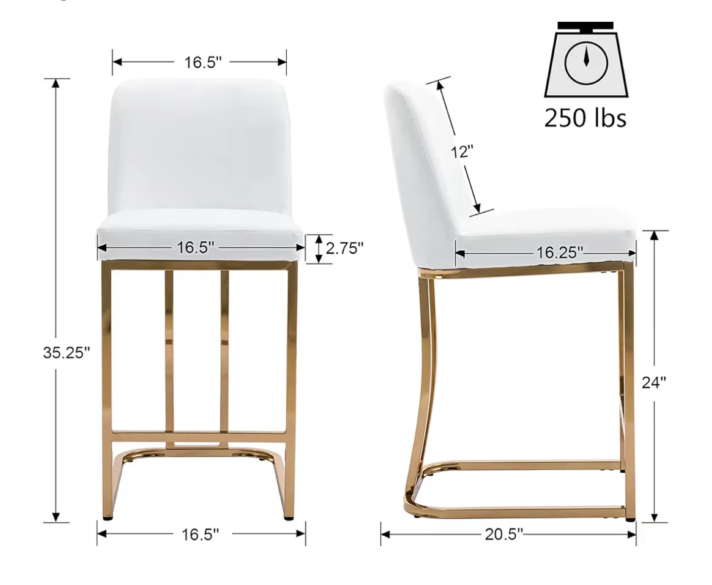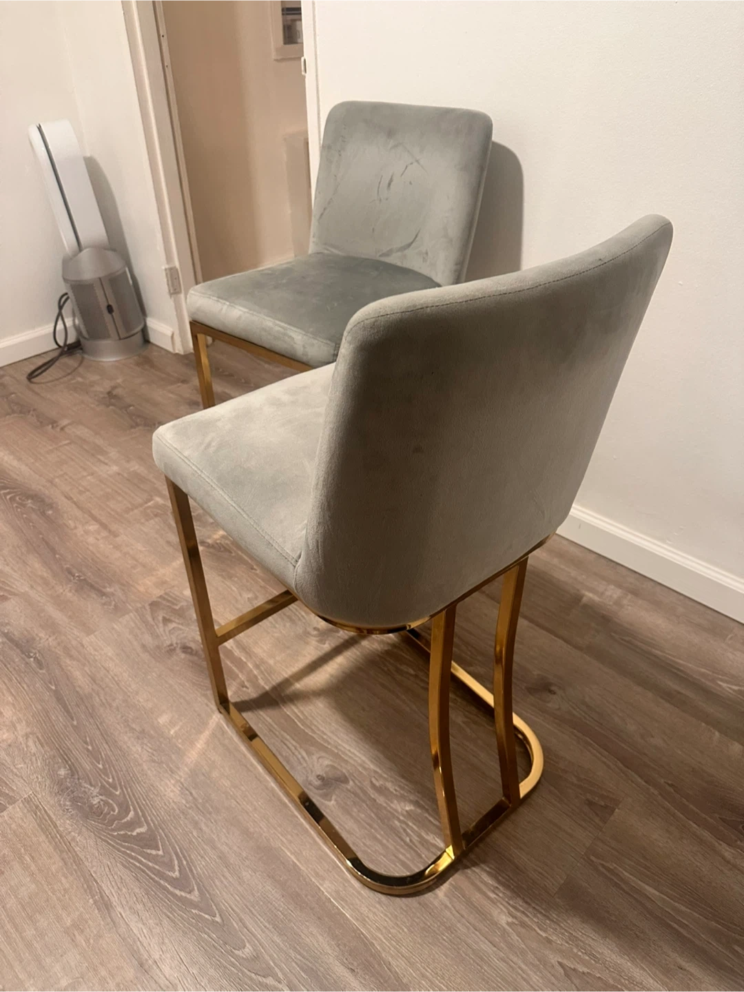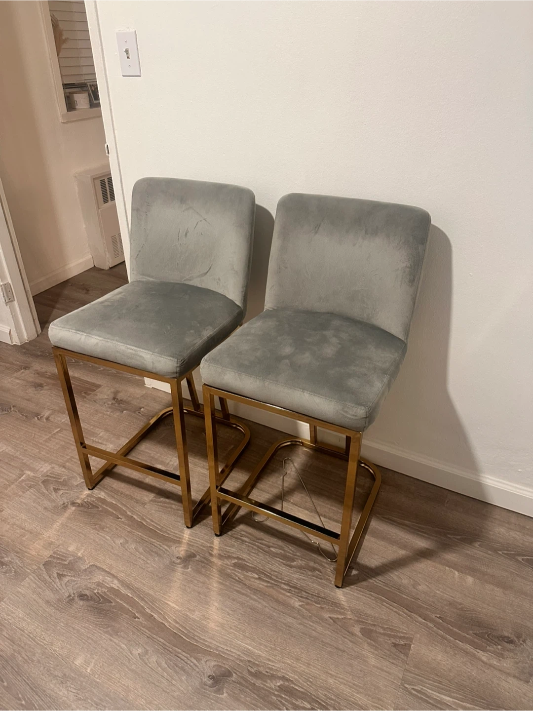 Selling a pair of stylish bar stools featuring a gray velvet seat and a sleek gold metal frame. They're in great condition and would add a touch of elegance to any kitchen or bar area.