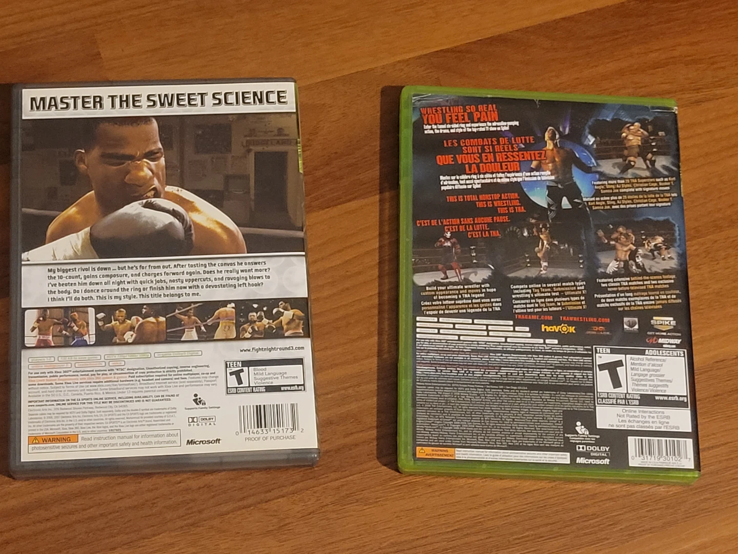 Selling two used Xbox 360 games: Fight Night Round 3, an exciting boxing simulation featuring realistic graphics, and TNA Impact!, a wrestling game with intense, nonstop action. Both games are in good condition and ready for a new round of play.