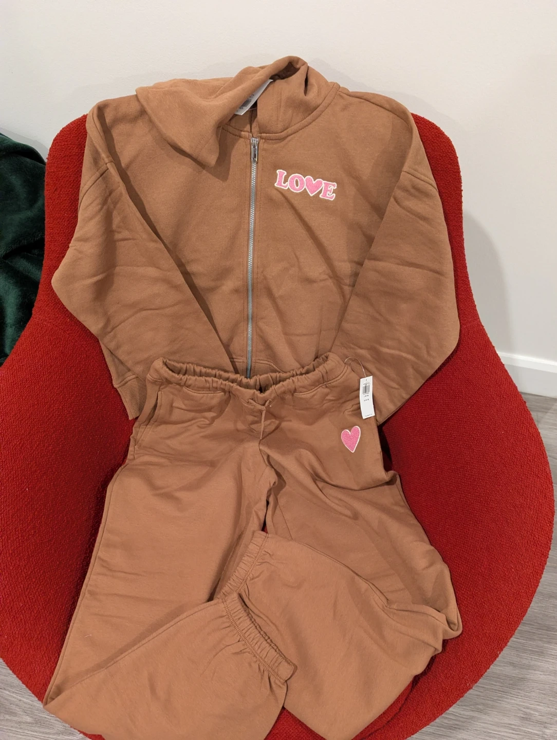 Selling a super cute Old Navy matching set! It's a comfy brown colour and features a 'LOVE' design on the hoodie and a heart on the pants. Perfect for lounging around or running errands in style