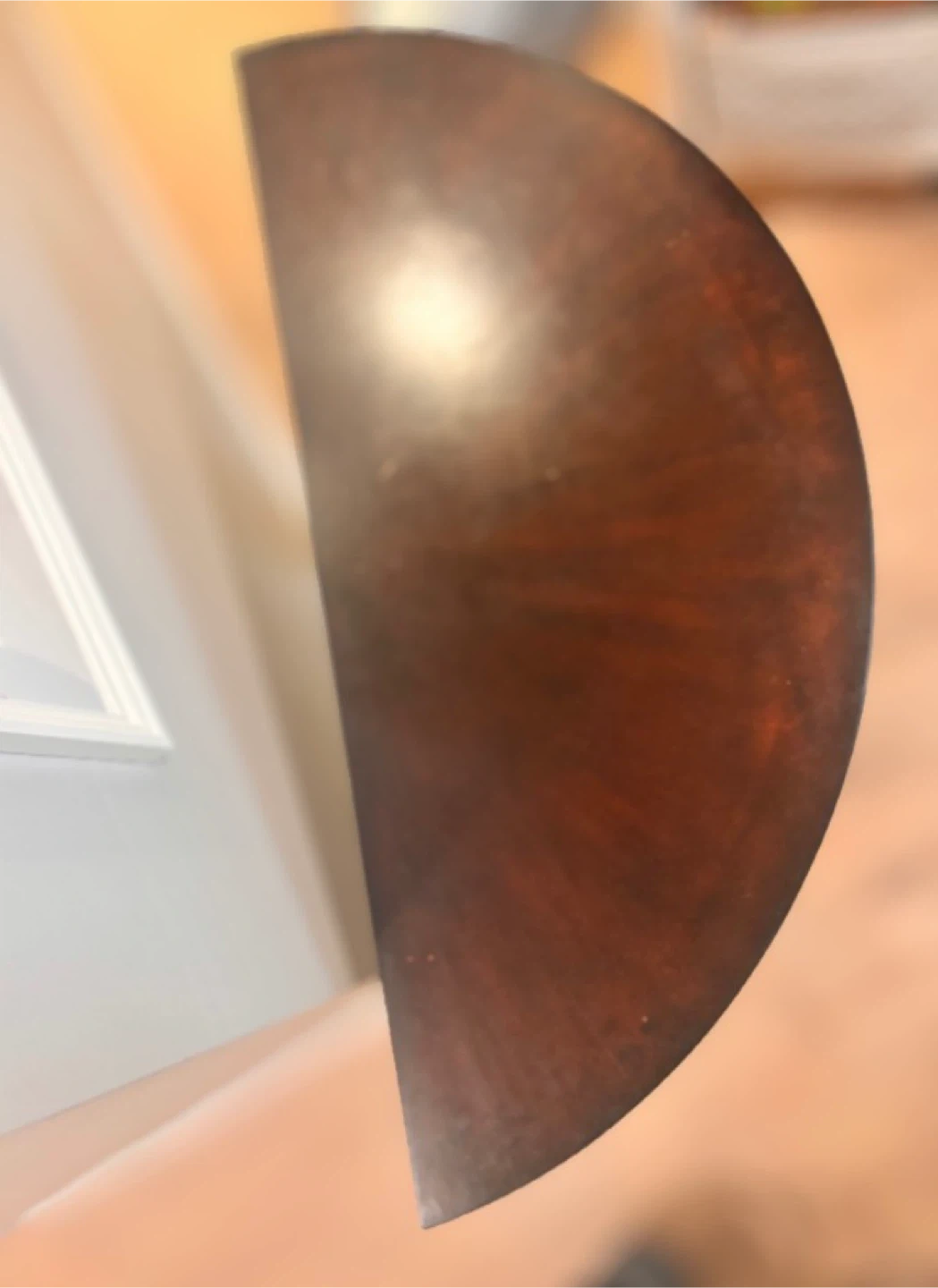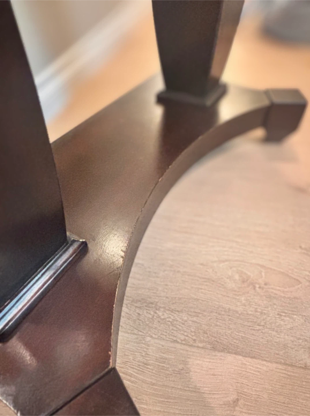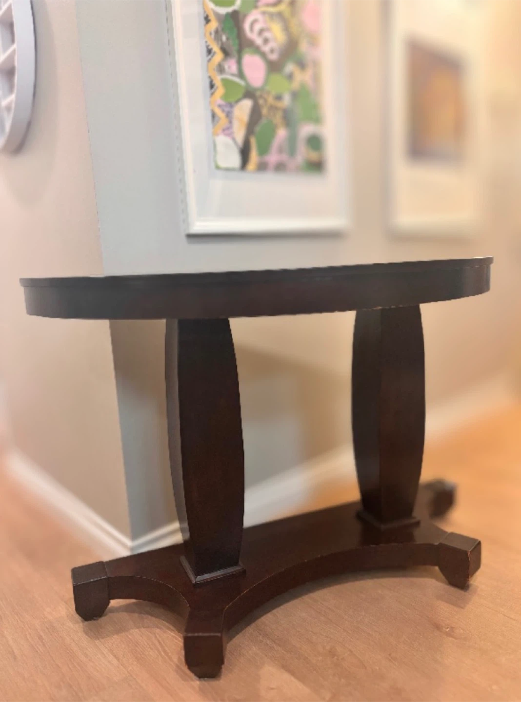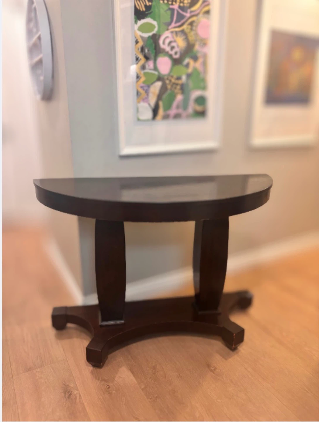 Selling a dark brown half-moon shaped console table. It's a lovely piece for any entryway or living space, adding a touch of elegance. There are minor scratches on edges as shown in the photo above.