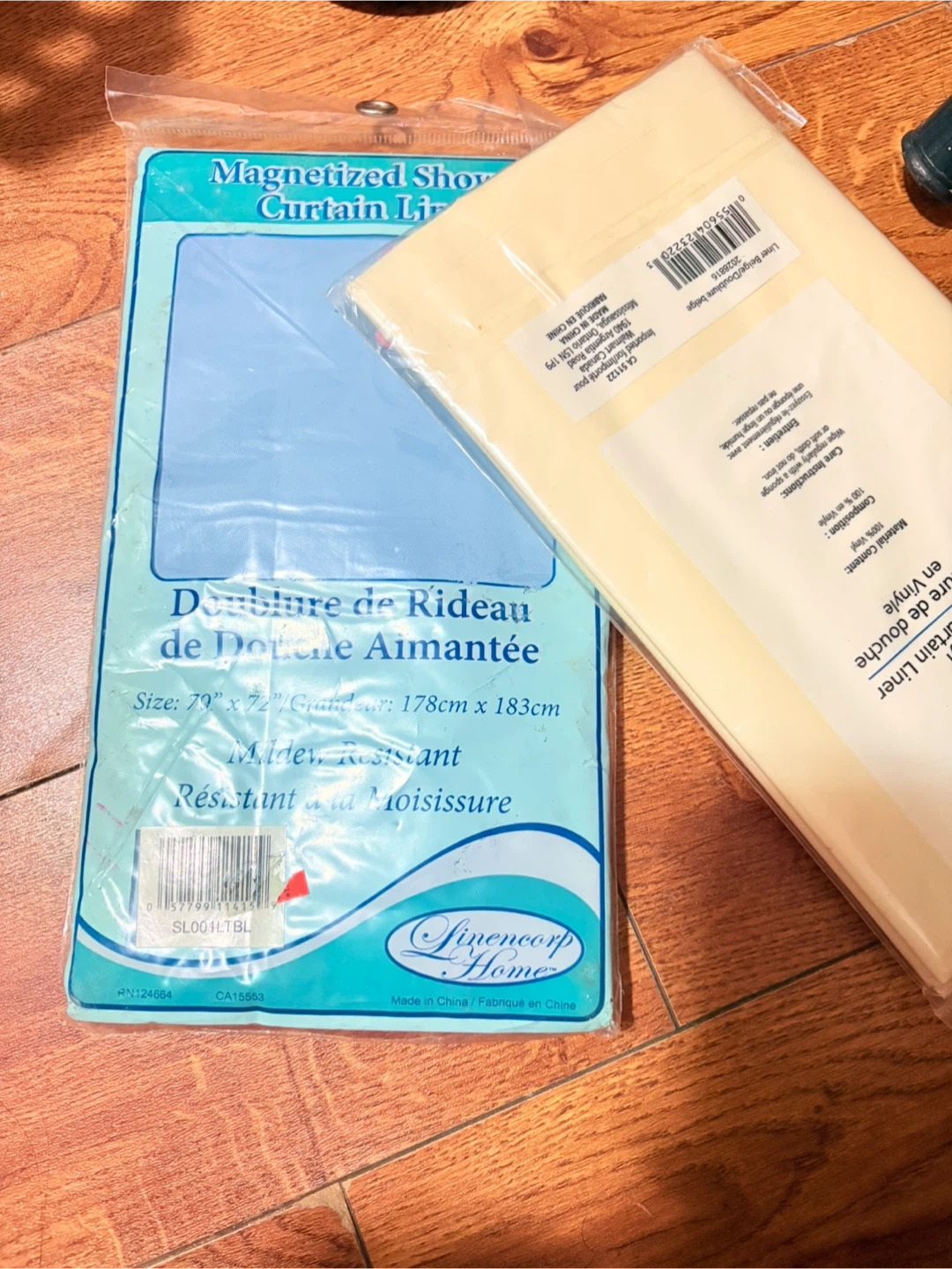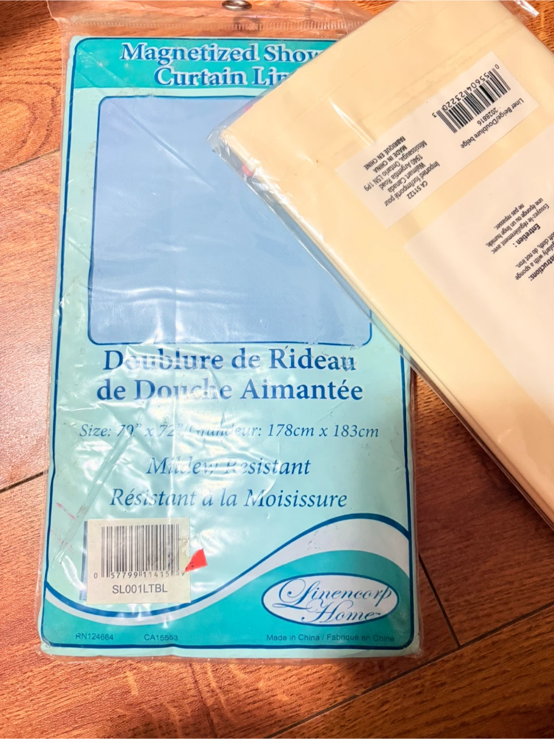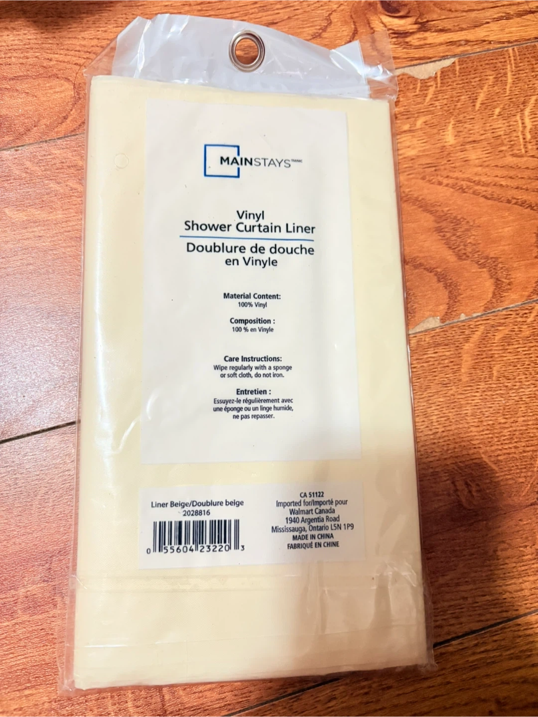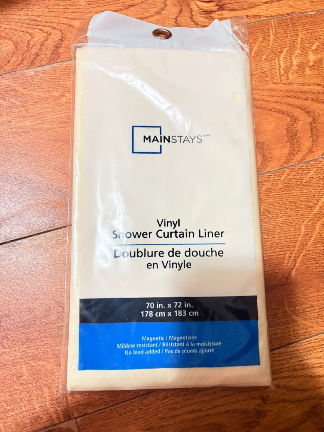 Selling a brand new MAINSTAYS vinyl shower curtain liner, still in its original packaging! It's beige and measures 70 inches by 72 inches. The material is 100% vinyl. It is mildew resistant and has no lead added