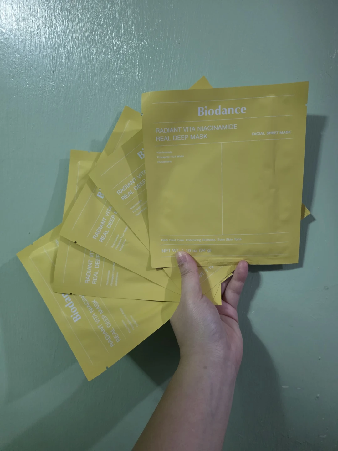 NEW Biodance Radiant Vita Niacinamide Real Deep Masks! These facial sheet masks contain niacinamide and pineapple fruit water. They help with dark spot care, improving dullness, and evening skin tone. Each mask has a net weight of 1.19 oz (34 g). Expires Oct/23/2027 (4 sheets) and Nov/28/2027 (1 sheet).