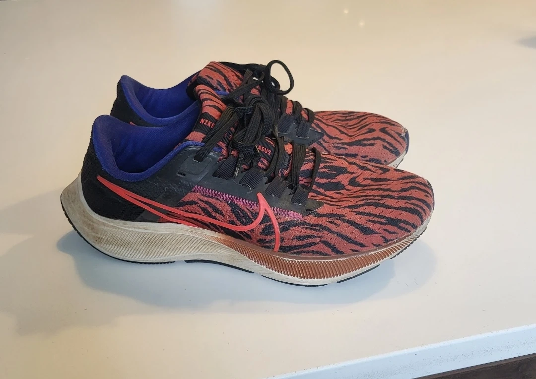 Selling a pair of Women's Nike Pegasus running shoes with a unique animal print design in size 8! These shoes are perfect for running or casual wear. They show some signs of wear, but still have lots of life left in them