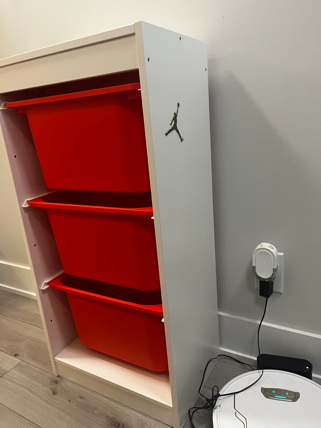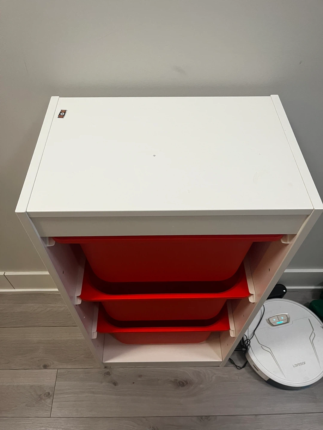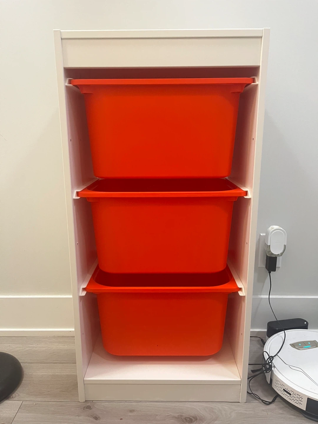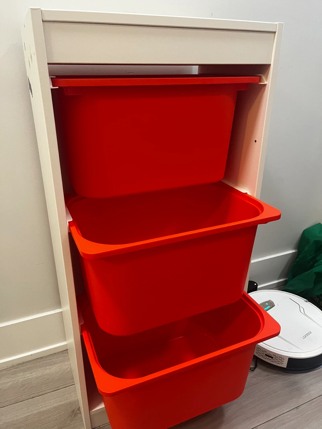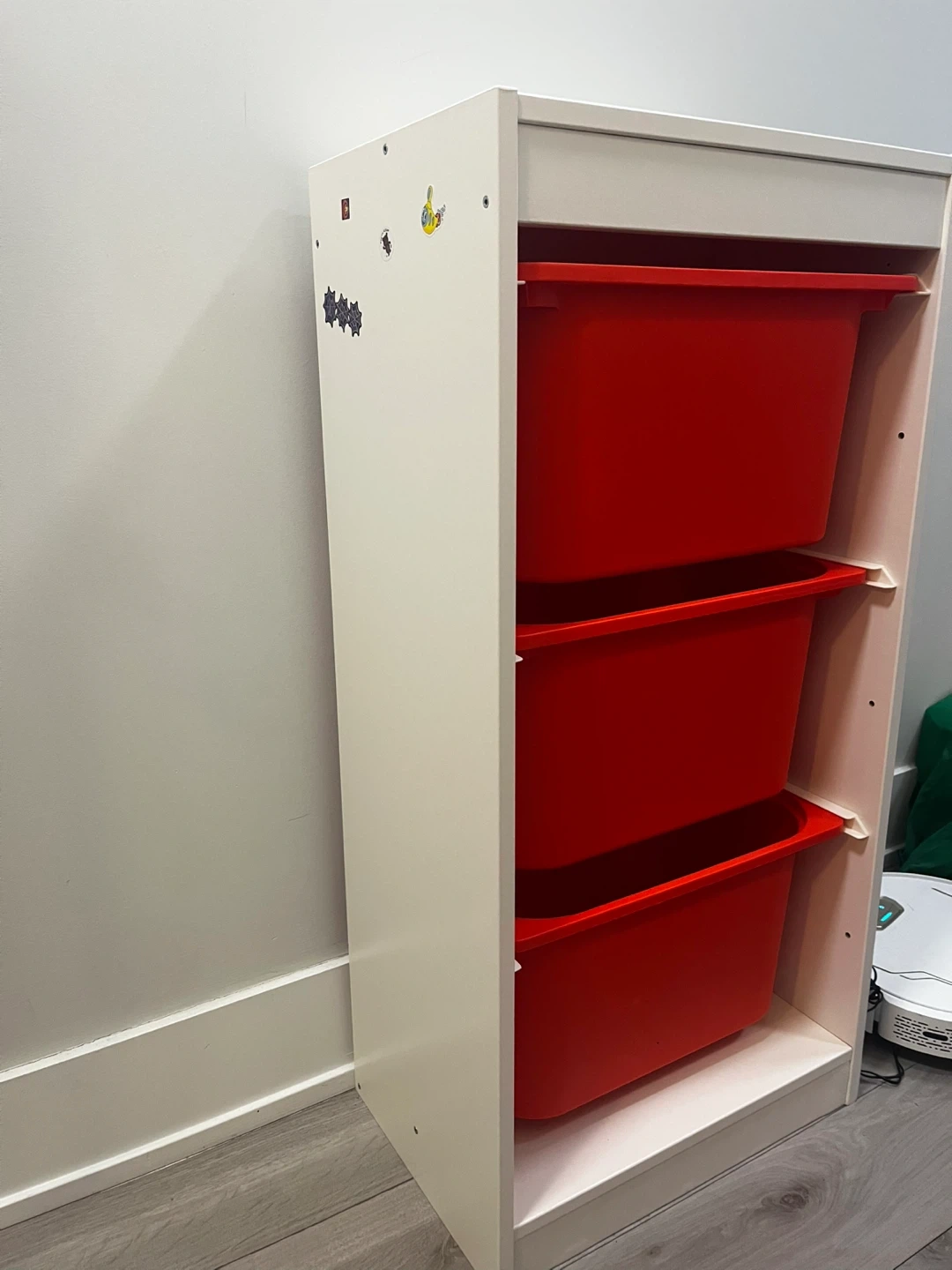 It features a white frame with three vibrant red bins, perfect for keeping toys, books, and art supplies neatly organized.