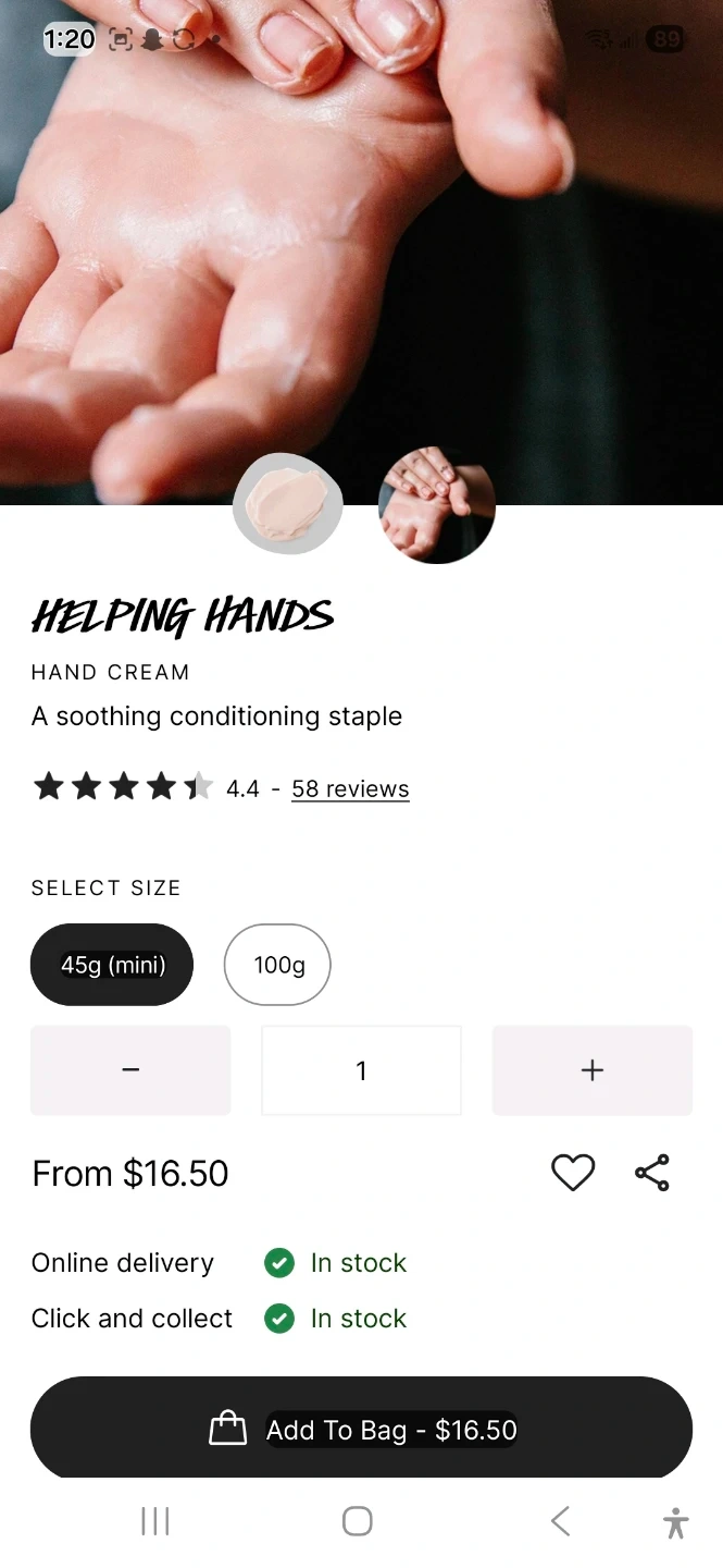 I have a Lush Helping Hands hand cream for sale! It's a soothing conditioning staple. The size is 45g (mini). Originally from $16.50!
