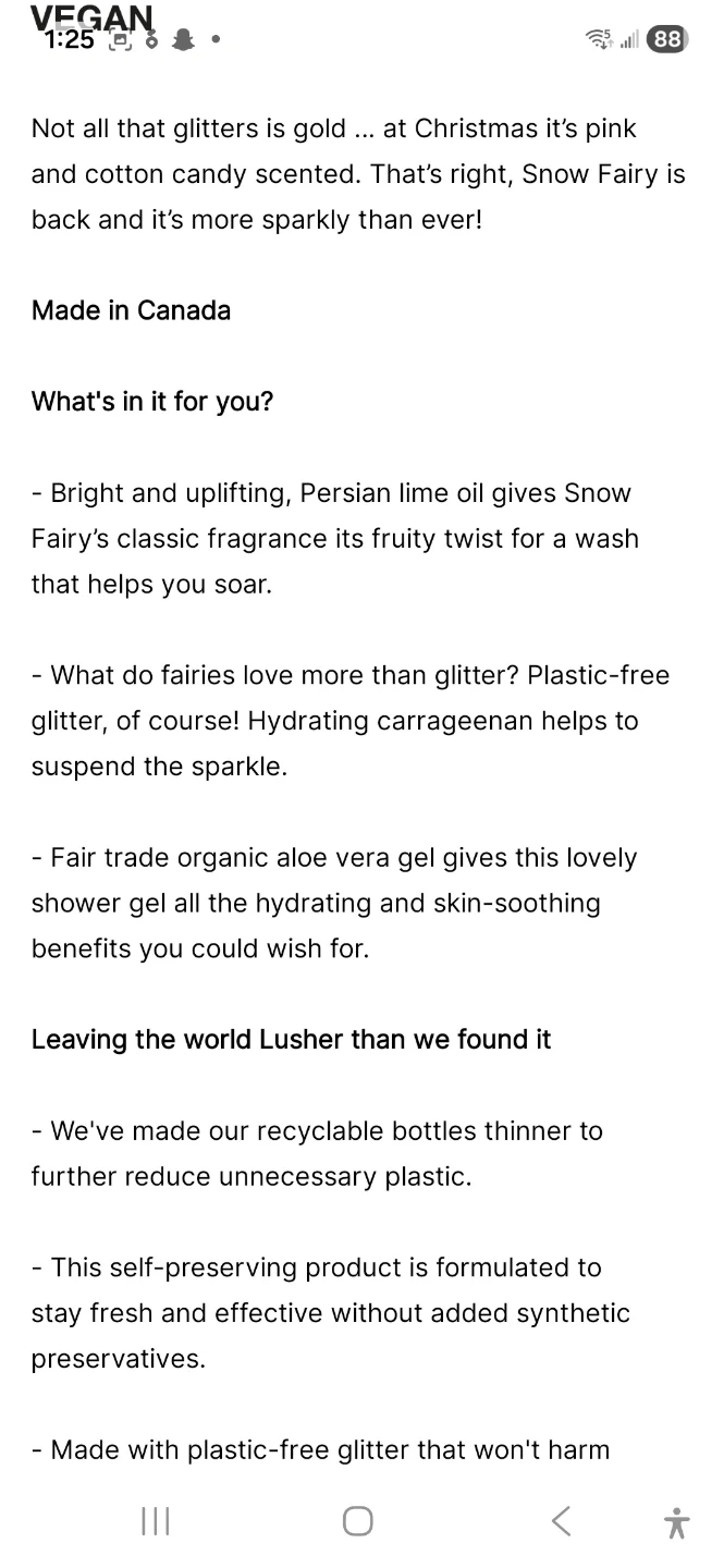 Treat yourself to a little sparkle with Lush's Snow Fairy Glitter shower gel! This 55ml bottle is perfect for adding a touch of magic to your shower routine. It's made in Canada and features plastic-free glitter that won't harm the environment. Enjoy the bright and uplifting Persian lime oil that gives Snow Fairy's classic fragrance its fruity twist!