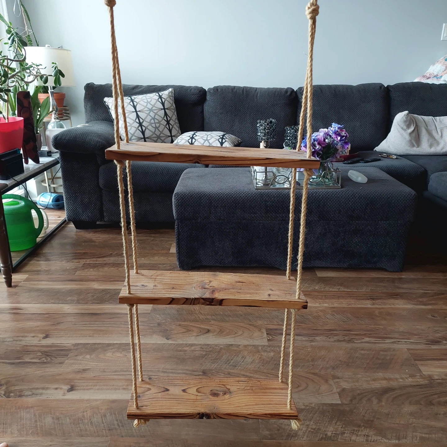 Add a touch of rustic charm to your home with this wooden hanging rope shelf! It features three tiers of sturdy wooden planks suspended by durable rope. Perfect for displaying plants, photos, or other decorative items. It's in great condition and ready to bring a unique touch to any room