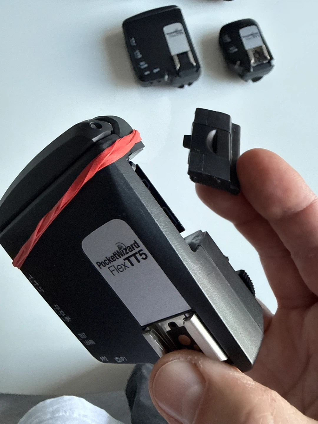 Selling a PocketWizard FlexTT5 (x3) and MiniTT1 (x2) set. These are great for off-camera flash photography. They're in good condition and ready to use. One TT5 has a broken battery cover, but works perfectly fine with elastic lol.