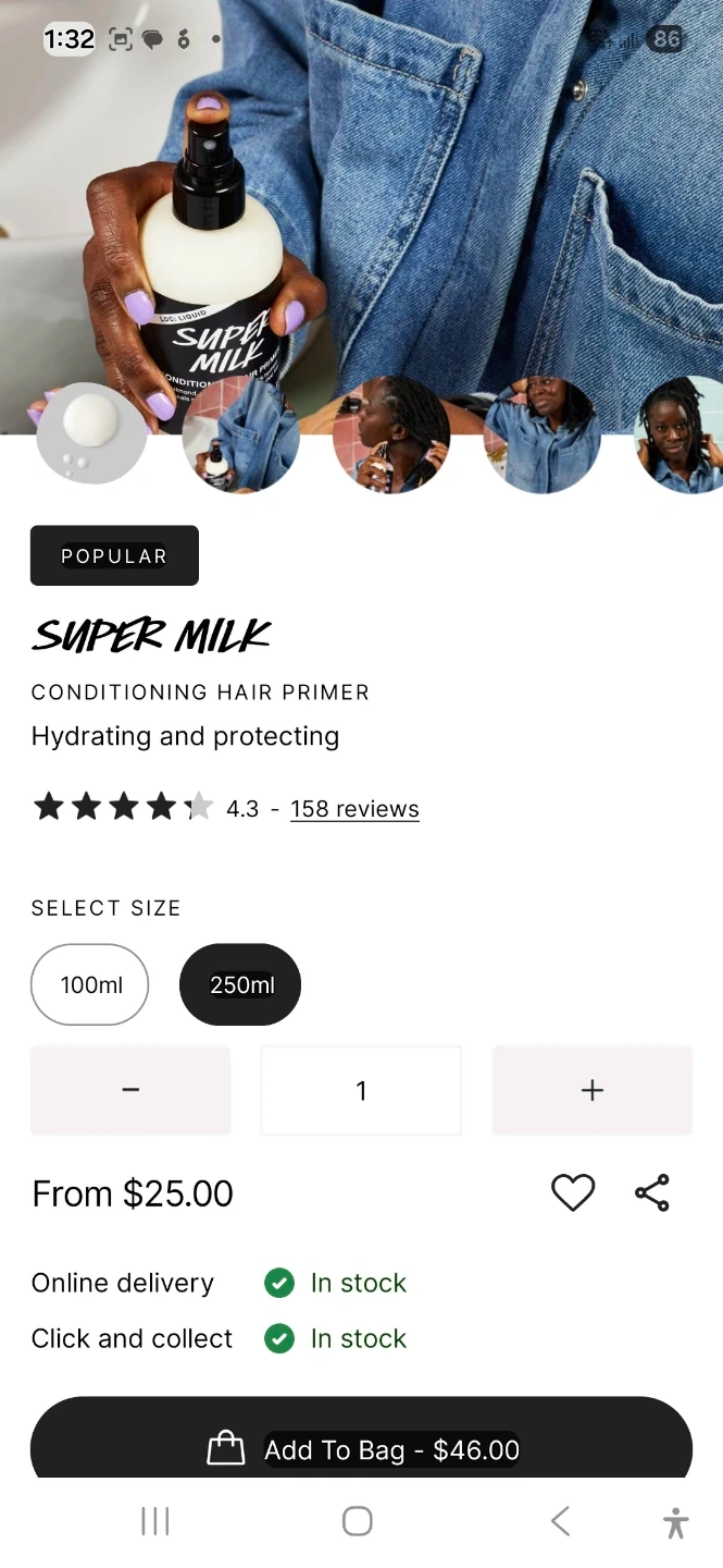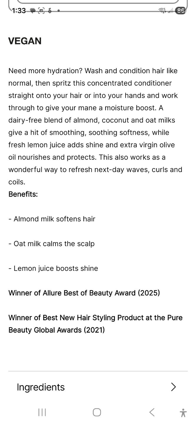 Selling a Super Milk Conditioning Hair Primer in the 250ml size. This vegan hair primer is designed to hydrate and protect your hair. It's a concentrated conditioner that can be spritzed onto hair to give it a moisture boost. The dairy-free blend of almond, coconut, and oat milks provides smoothing and softening benefits, while lemon juice adds shine and extra virgin olive oil nourishes and protects. Almond milk softens hair, oat milk calms the scalp, and lemon juice boosts shine