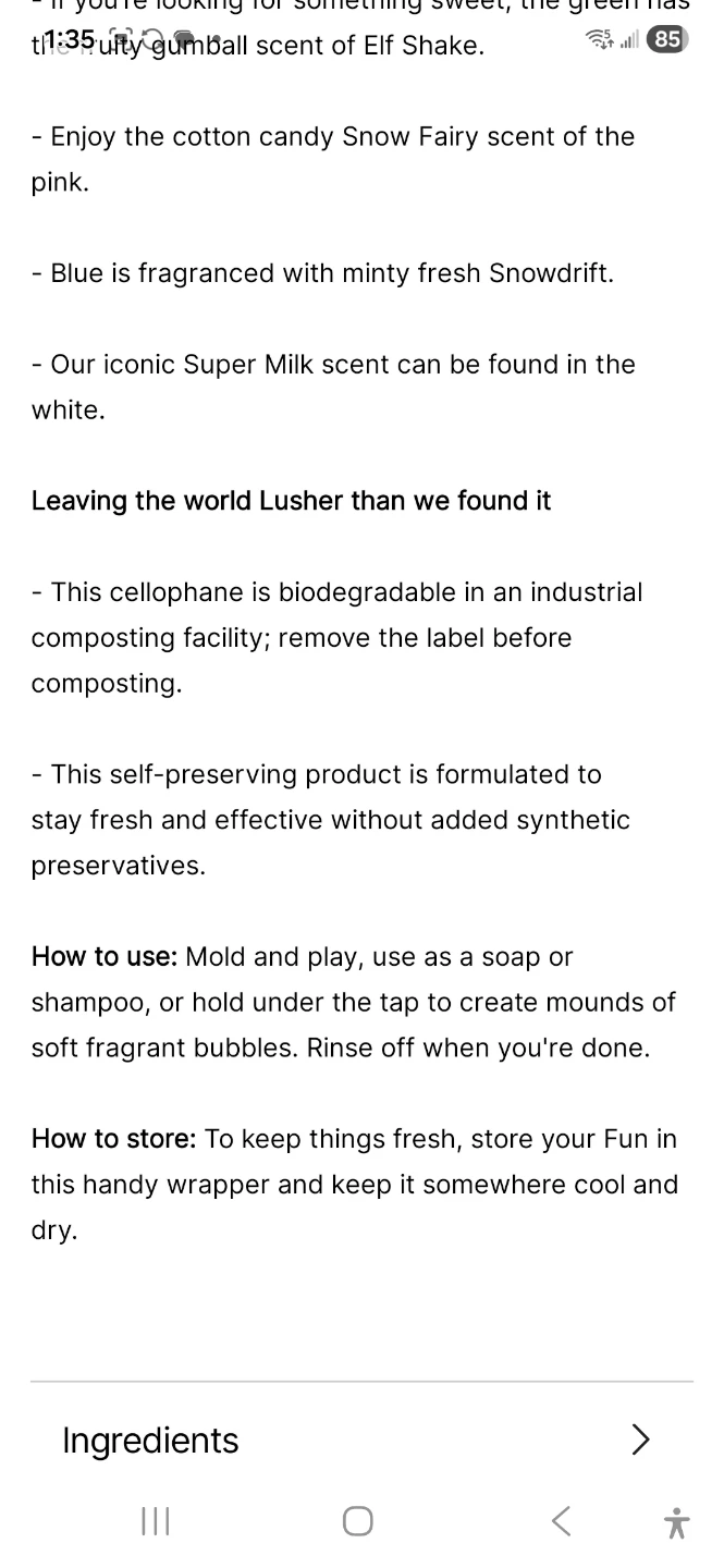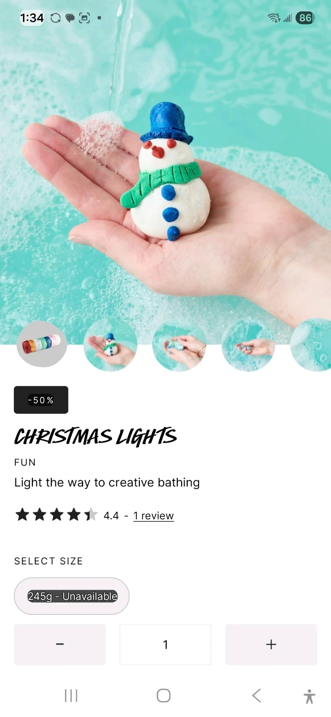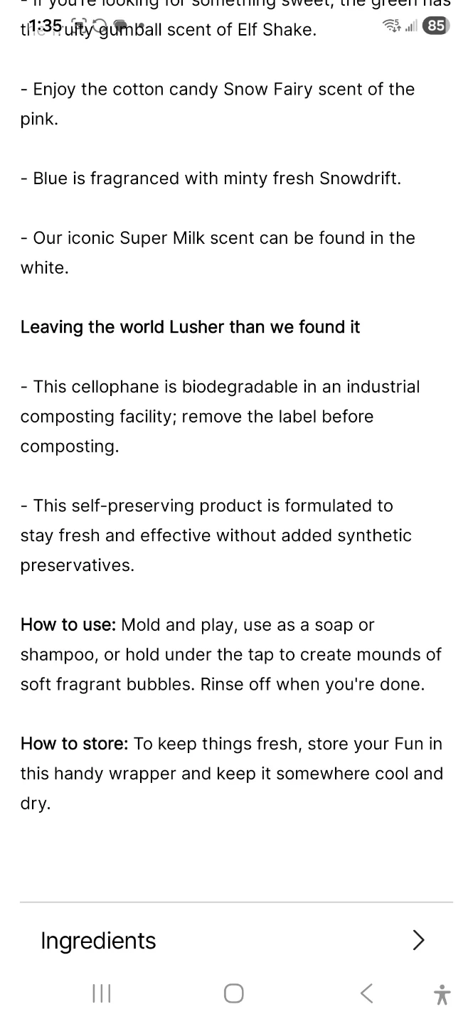 Get creative with bathing with this Lush Christmas Lights Fun soap! It features seven well-loved scents reimagined in fun form. Enjoy the spicy cinnamon scent of Glogg, fruity Golden Pear, sticky caramel scent of Shoot For The Stars, sweet green gumball scent of Elf Shake, cotton candy Snow Fairy scent, minty fresh Snowdrift, and Super Milk scent