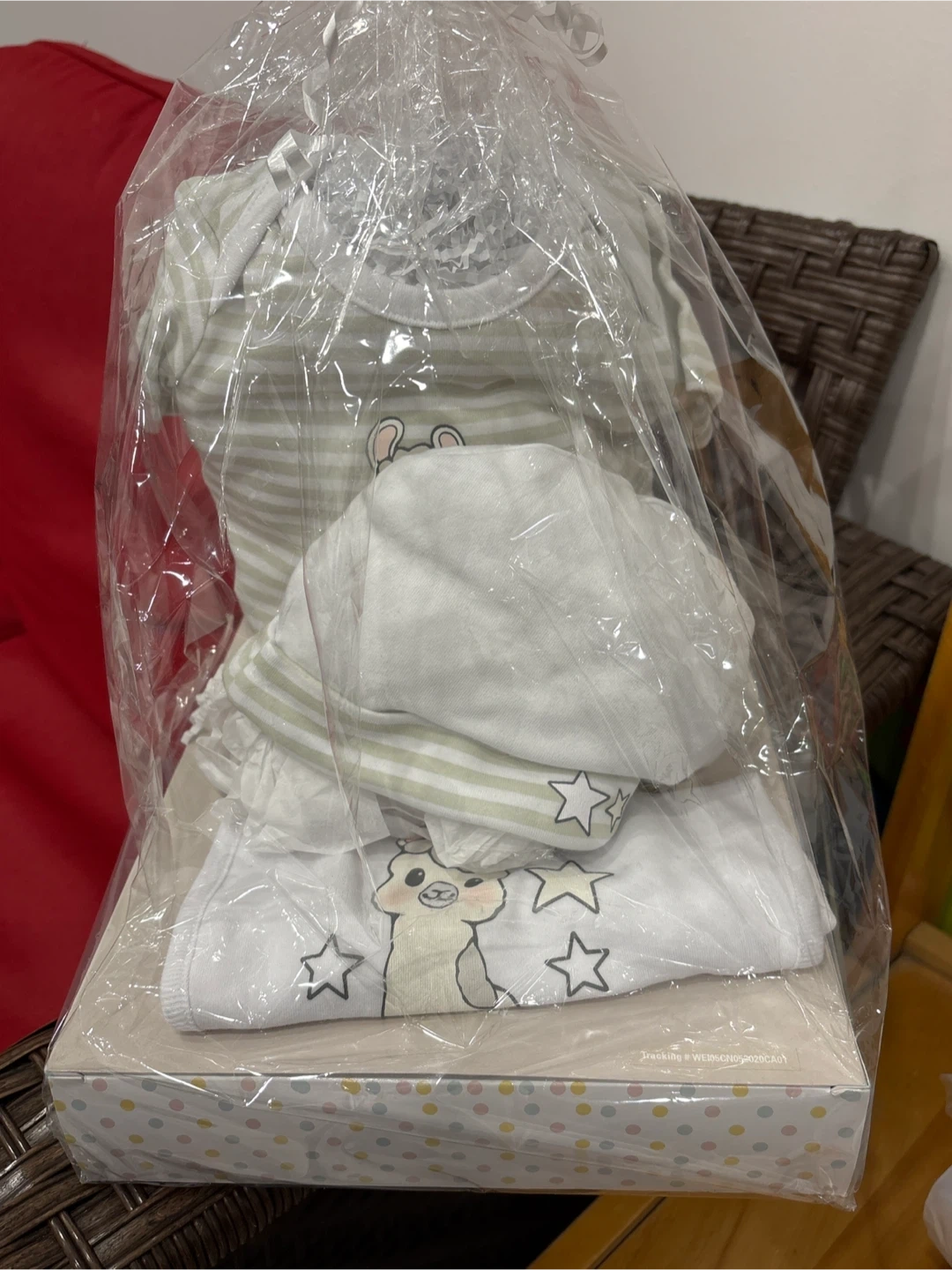 Selling a cute newborn baby gift set, still in its original packaging! It includes a onesie, a hat, and a blanket, all with adorable designs. Perfect as a gift for a new baby or baby shower