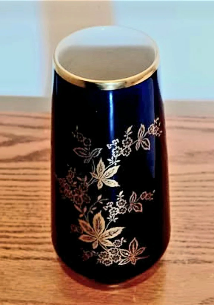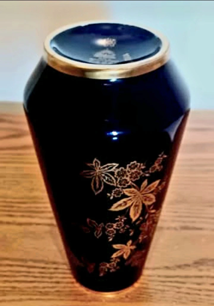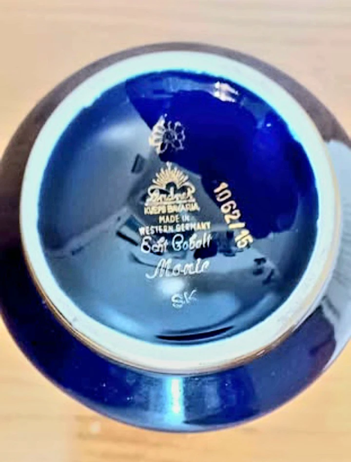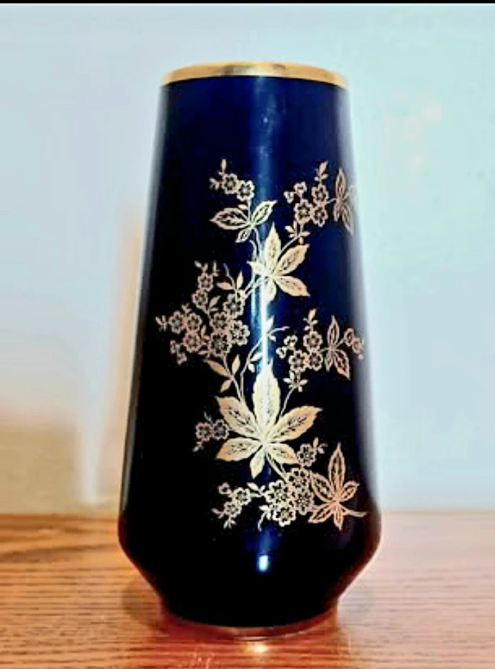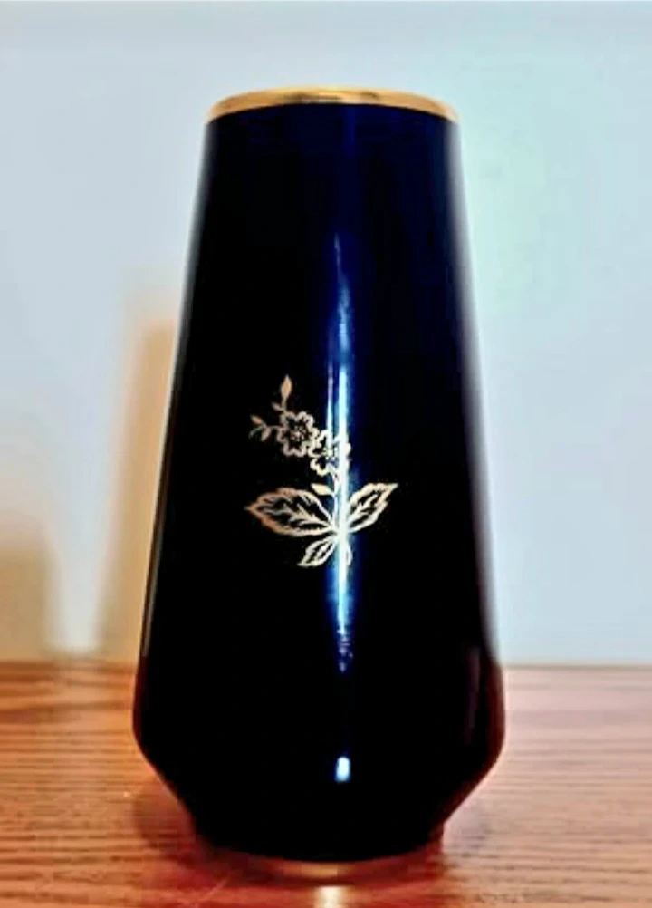 This is a lovely vintage vase from Bavaria, West Germany, featuring a dark cobalt blue colour with intricate gold detailing. This vase is a beautiful piece of craftsmanship and is in very good condition, perfect for collectors or as a decorative item in your home.