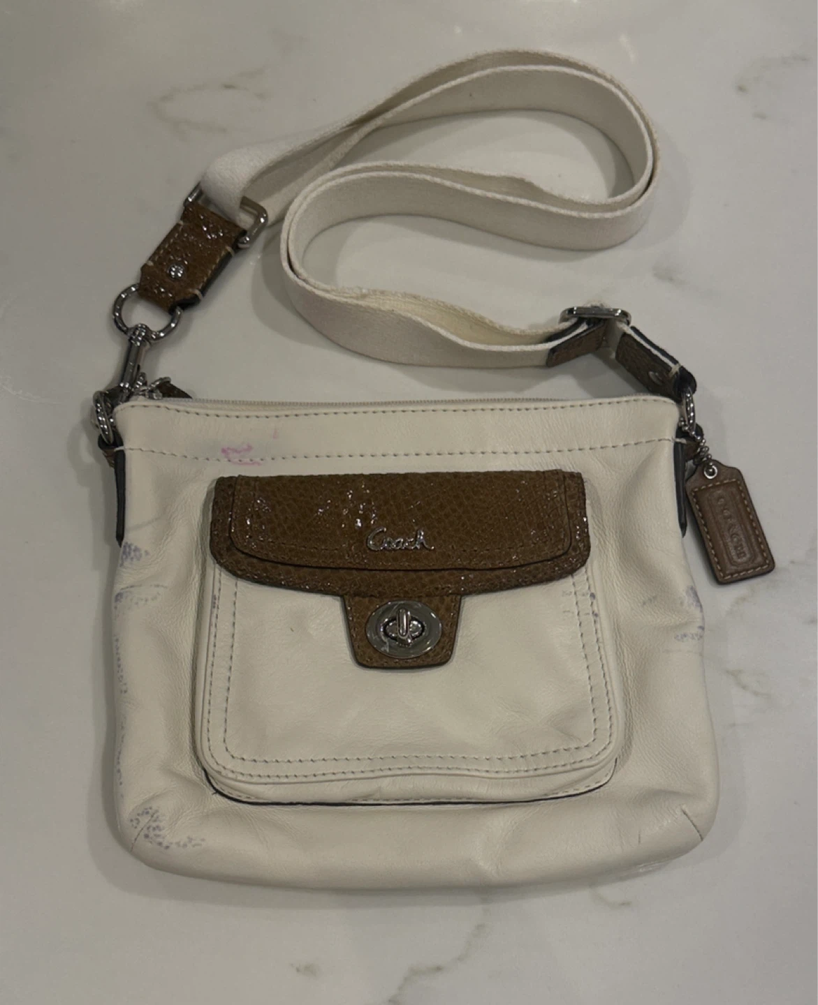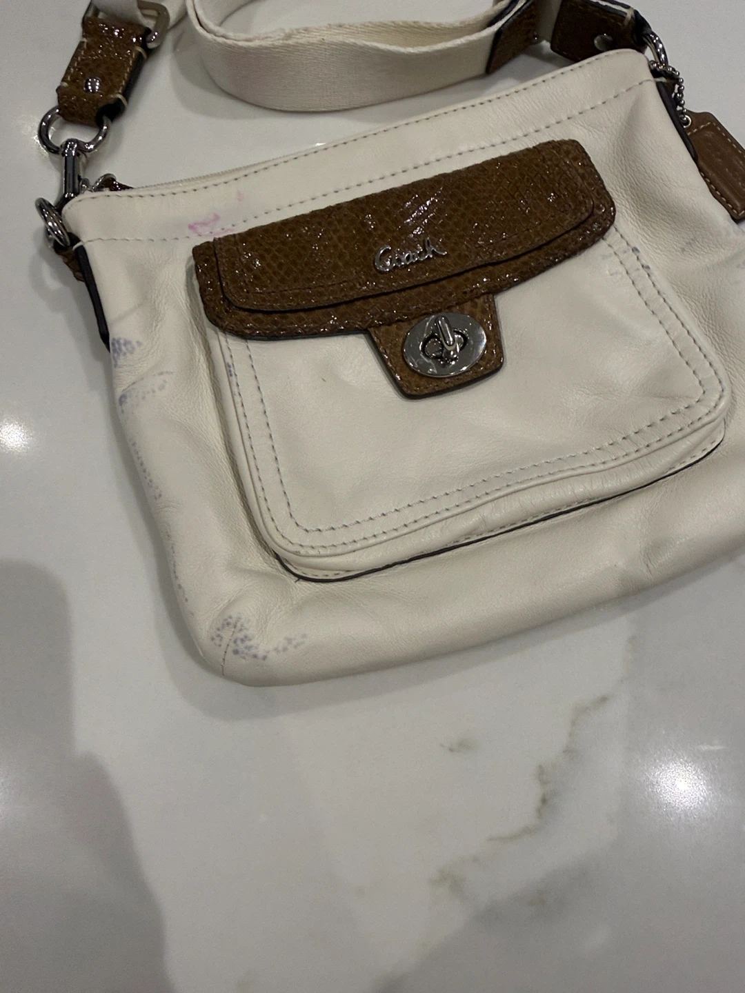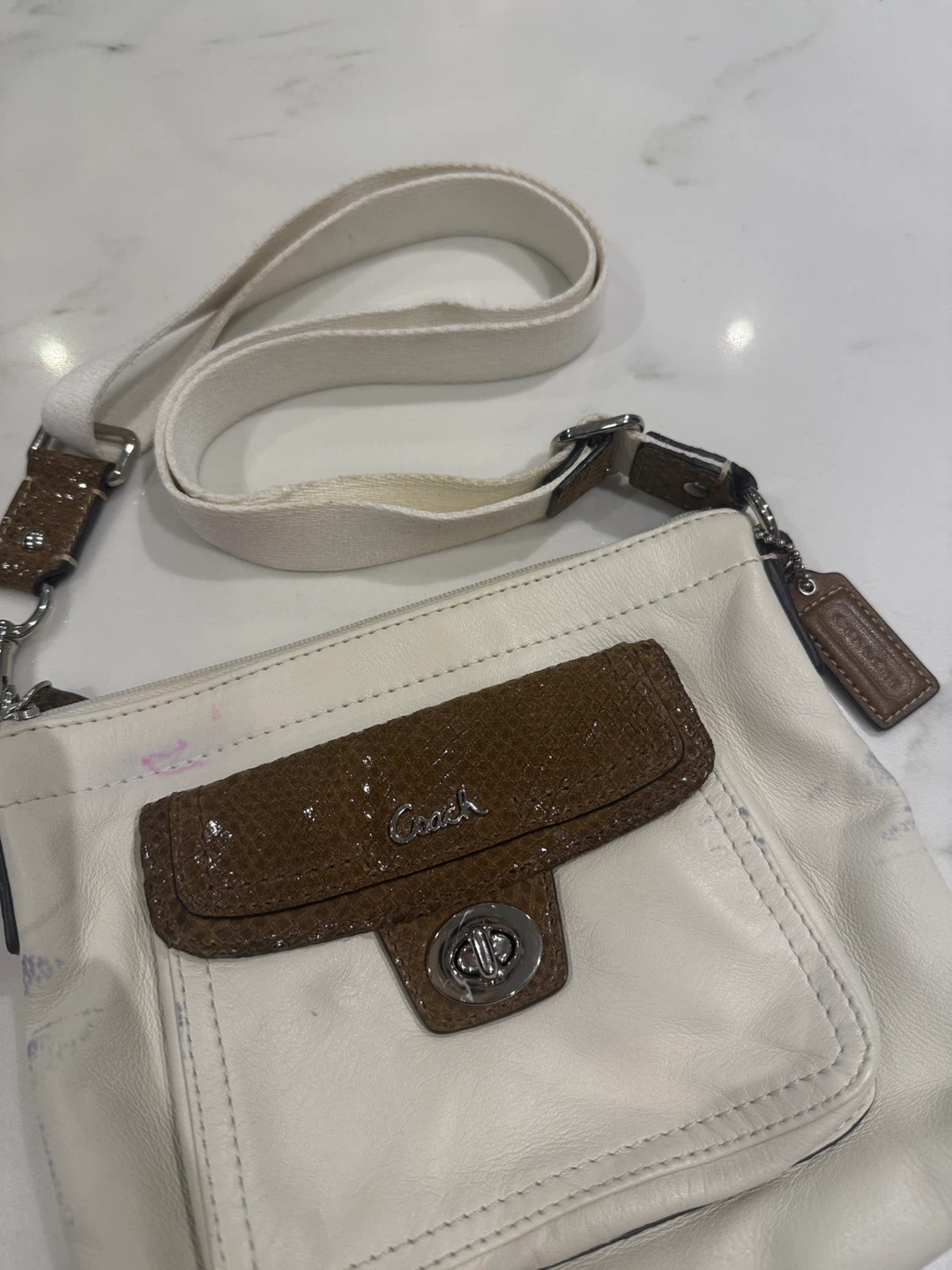 Selling a Coach crossbody bag. It's white leather with a brown snakeskin-like pocket. There are some signs of wear, as shown in the photos, but it's still a stylish bag!