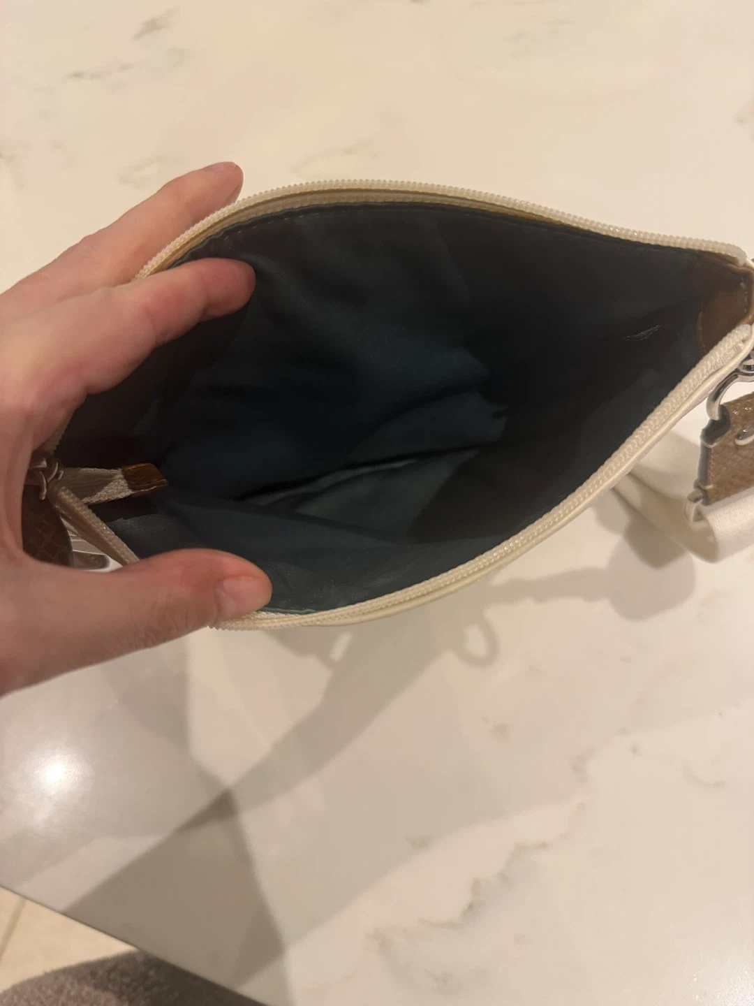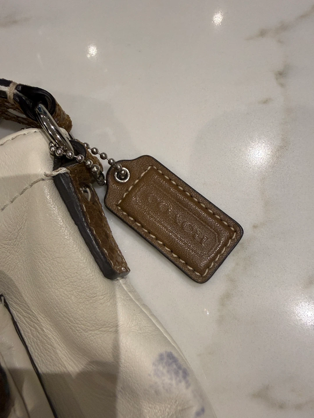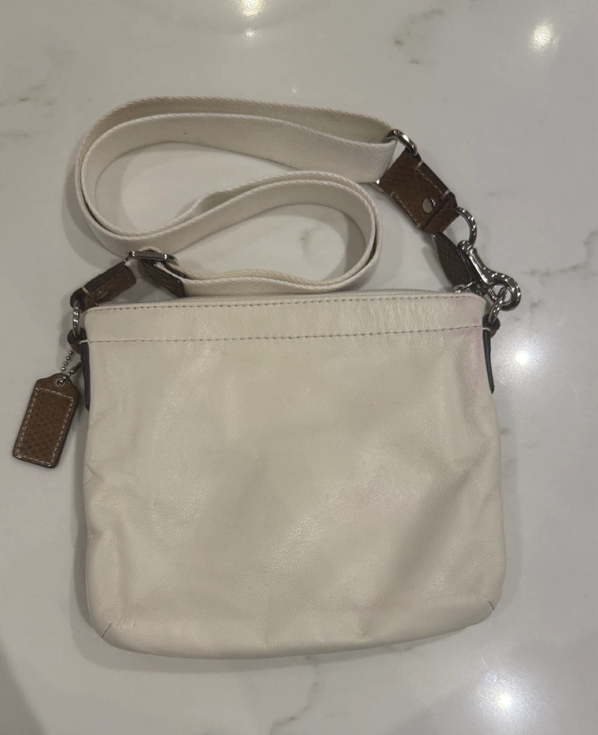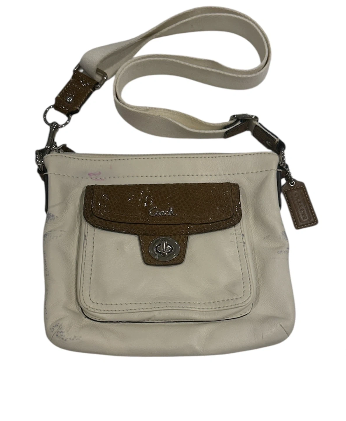 Selling a Coach crossbody bag. It's white leather with a brown snakeskin-like pocket. There are some signs of wear, as shown in the photos, but it's still a stylish bag!
