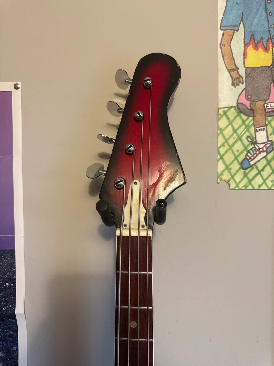 Selling a vintage electric bass guitar in red. It has a unique look and would be great for someone looking for a vintage instrument. It shows some signs of wear but is still in good working condition. Bought it in non working condition and got it repaired at a local shop so it sounds great now. Great vintage bass that I’ve seen on eBay for $350 CAD.