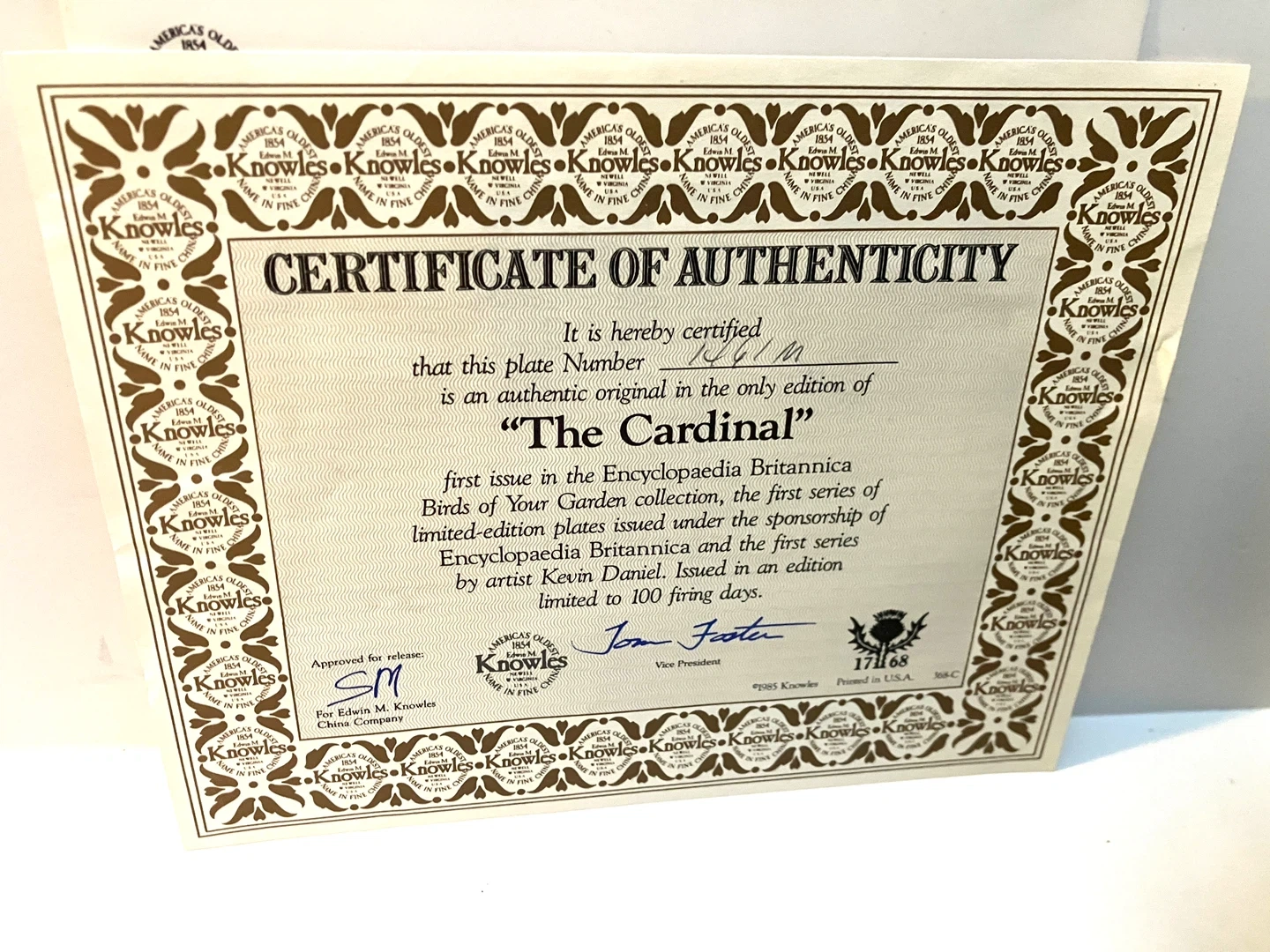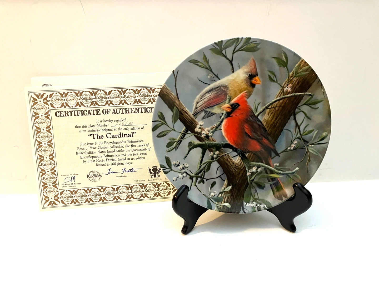 beautiful Knowles collector plate titled "The Cardinal". It's the first issue in the Encyclopedia Britannica Birds of Your Garden Collection, painted by Kevin Daniel. This plate is in excellent condition and ready to be displayed! With box and certificate