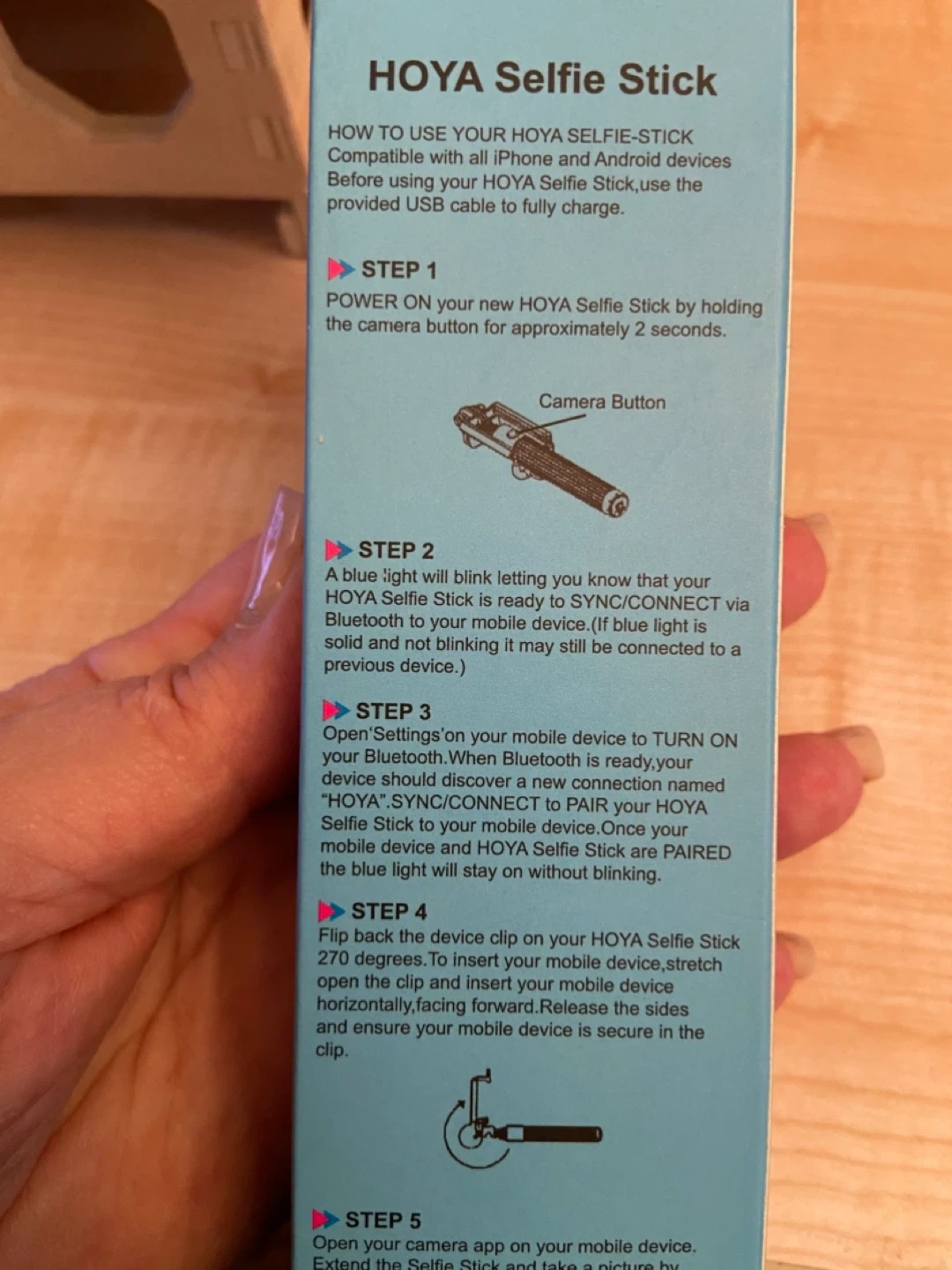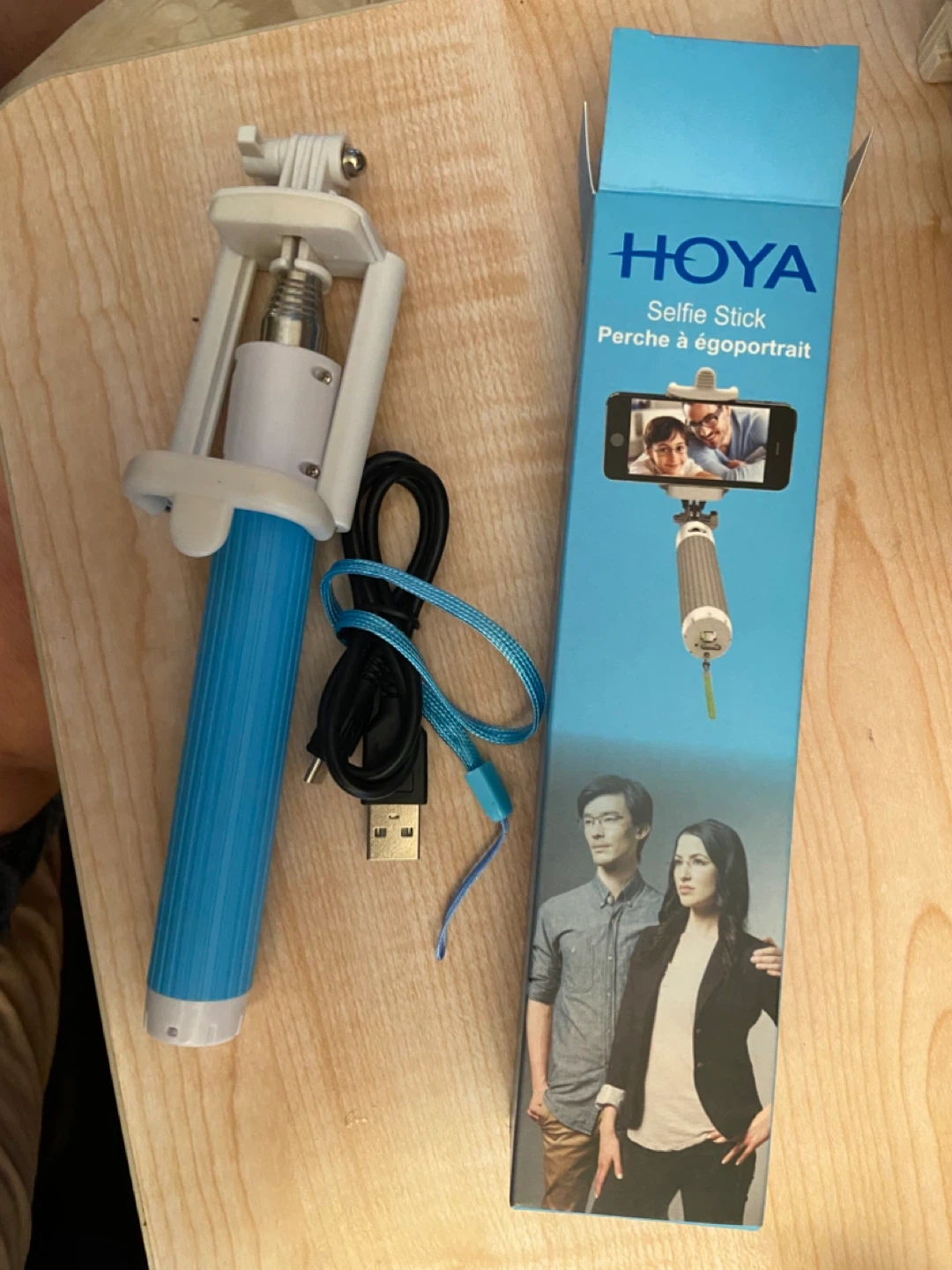 Selling a HOYA Selfie Stick. Compatible with all iPhone and Android devices. It's easy to use: simply power on, sync via Bluetooth, and pair your devices. Cones with strap and charging cable as well. The box is included.