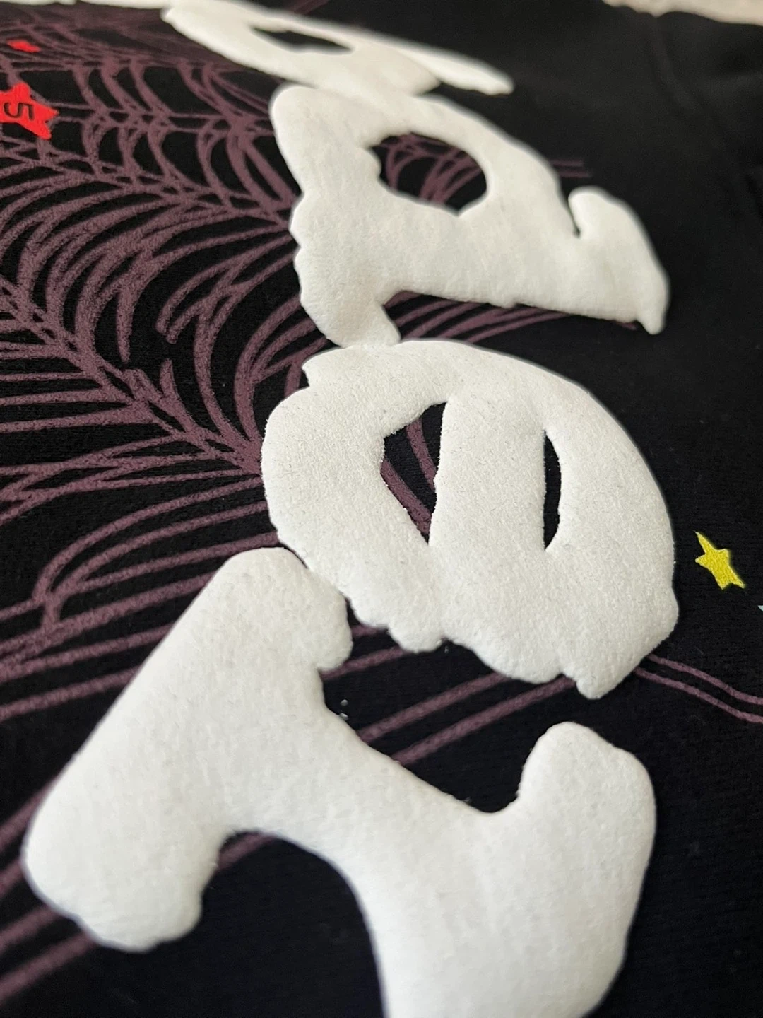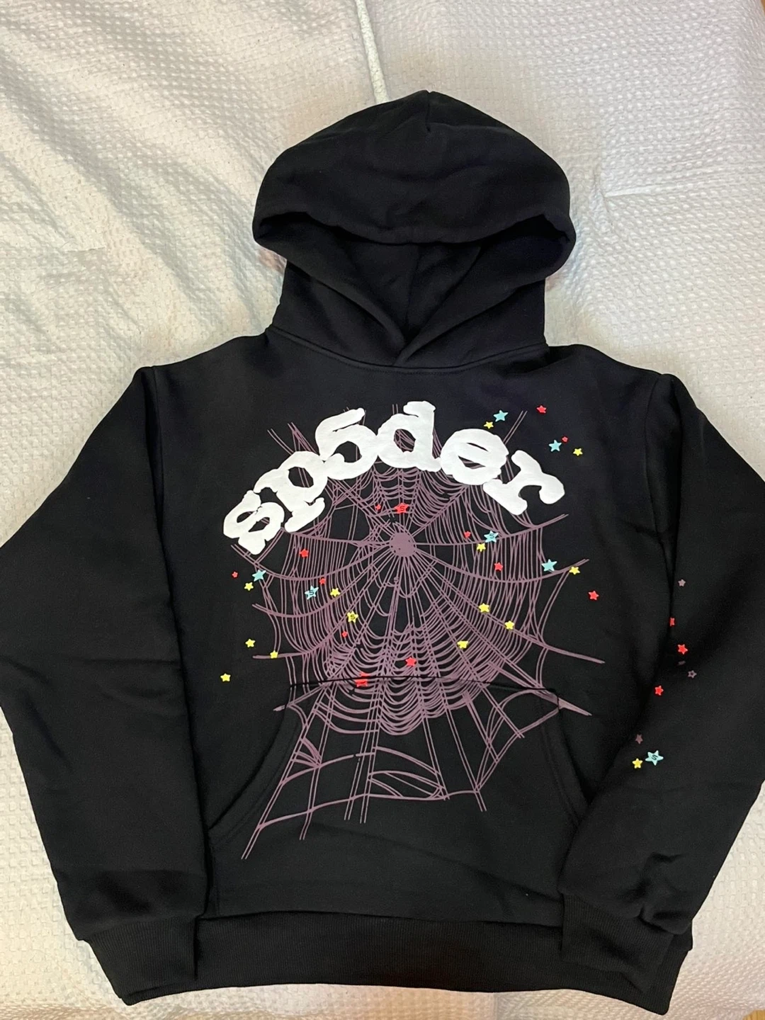Selling a black Sp5der hoodie. Features a spider web design with colourful stars. Great for casual wear!