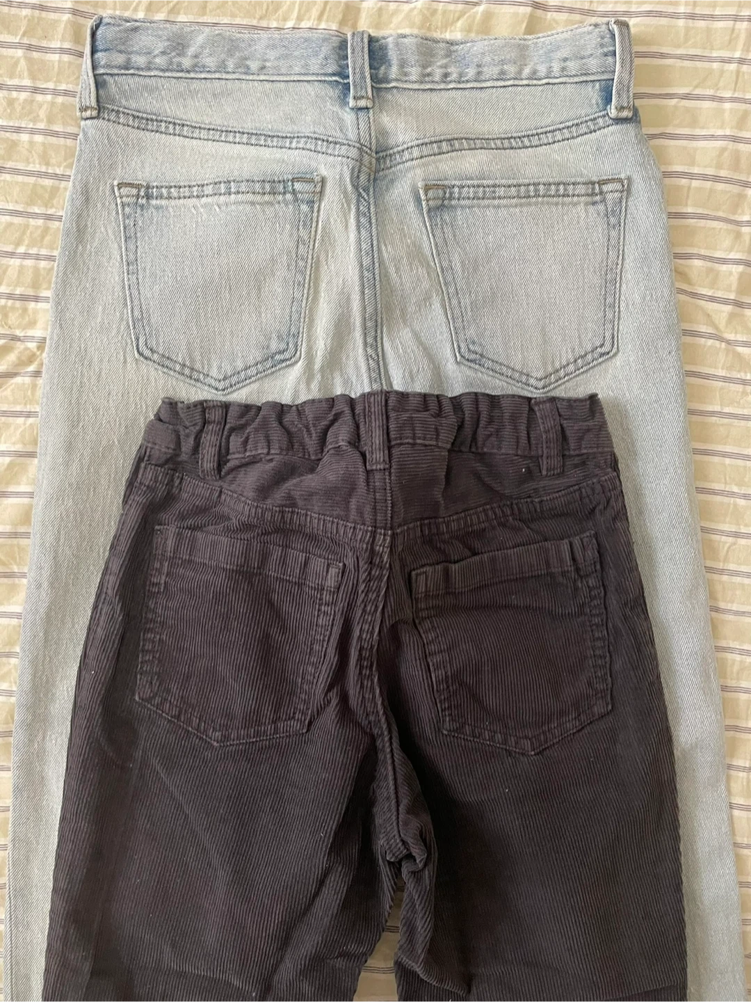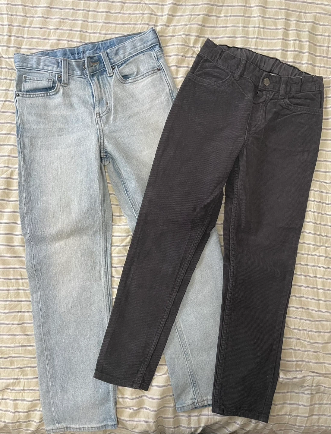 Selling two pairs of pants! One is a light wash denim and the other is a black corduroy. Both are in great condition. Size is 9-10 (140cm). Would fit a slim boy better.