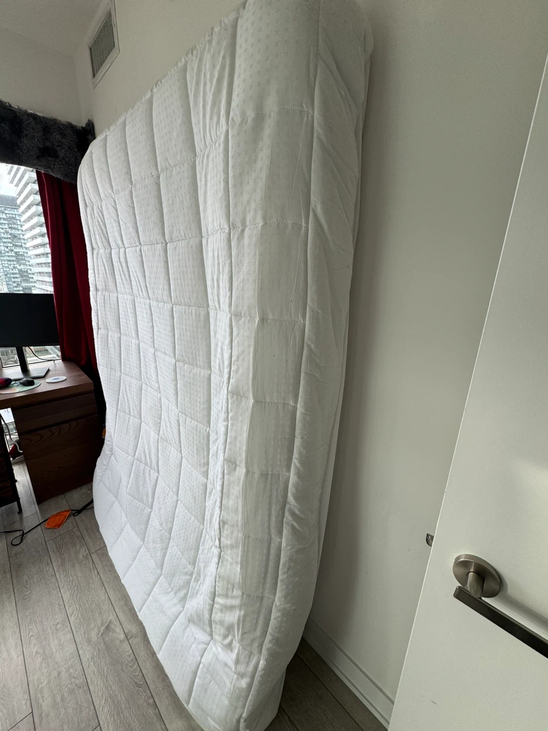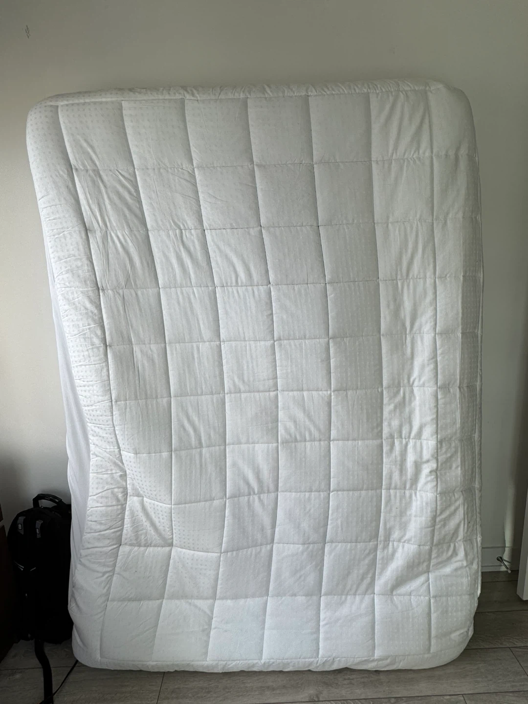 Selling a mattress in good condition. It's white and has a quilted pattern. Perfect for a bedroom!