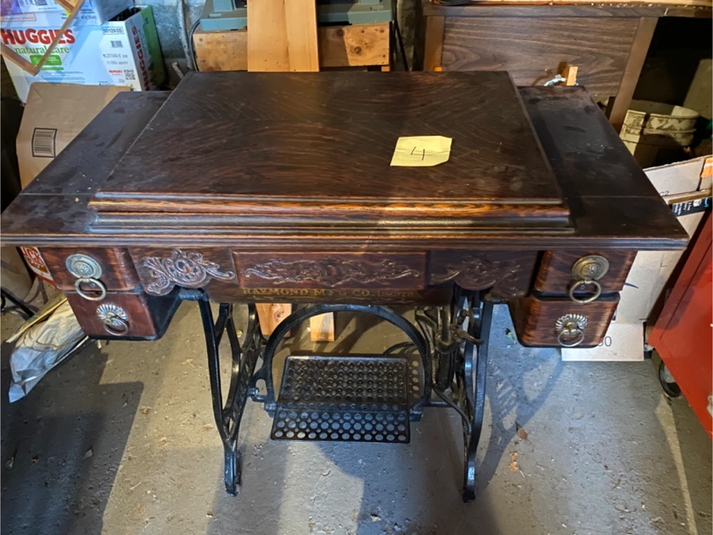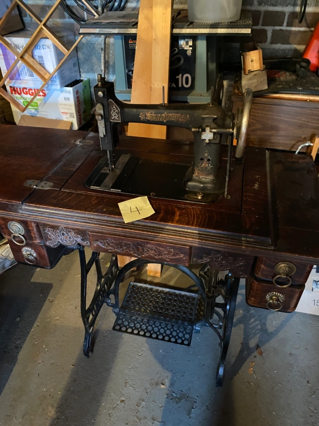 Selling an antique Raymond sewing machine. It features a beautiful, ornate design on the table and drawers. A great piece for collectors or those looking for a unique vintage item!