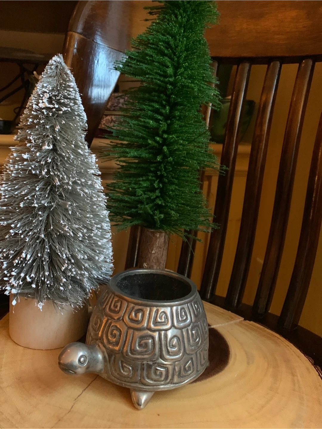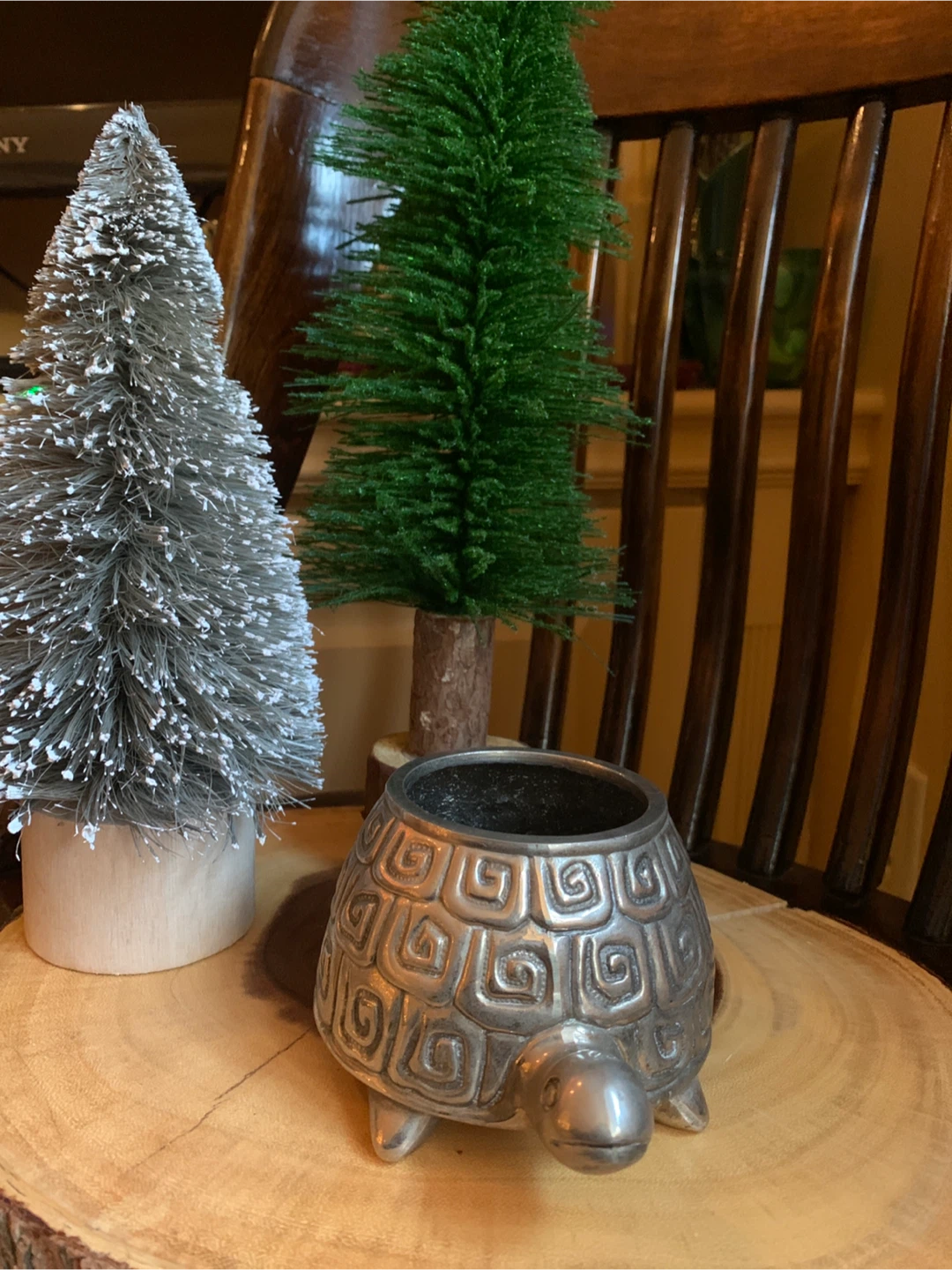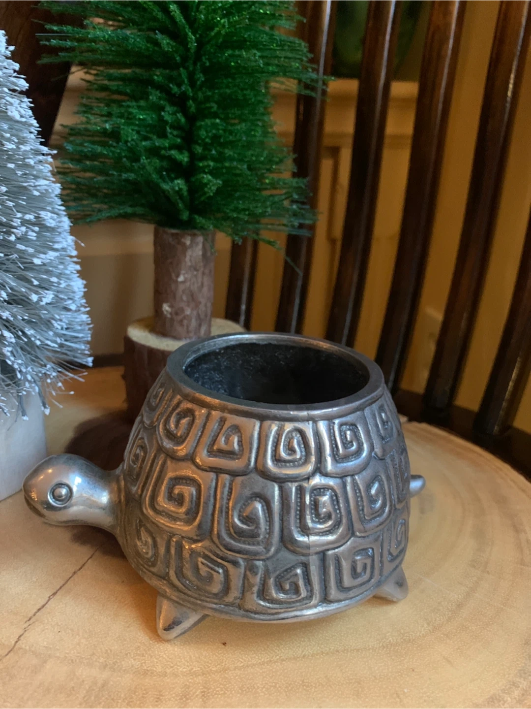 This is an adorable vintage silver plated, F. B. Rogers turtle planter dish! Would fit a cute succulent well. It could also be used as a trinket dish or a candle holder. It has a geometric design on it and has four little legs and a tail. This little guy would look great on a book stack, coffee table or on a bathroom vanity filled with make up brushes.