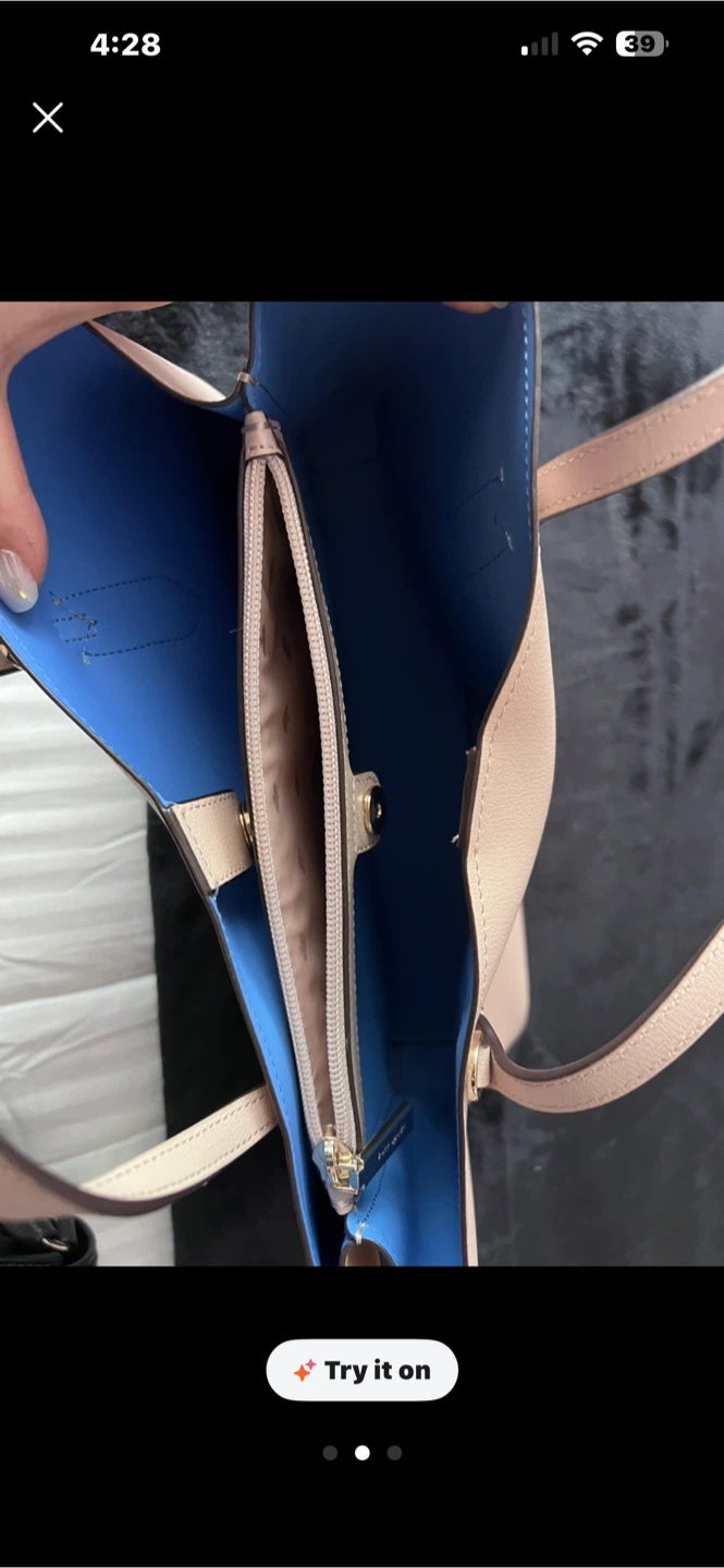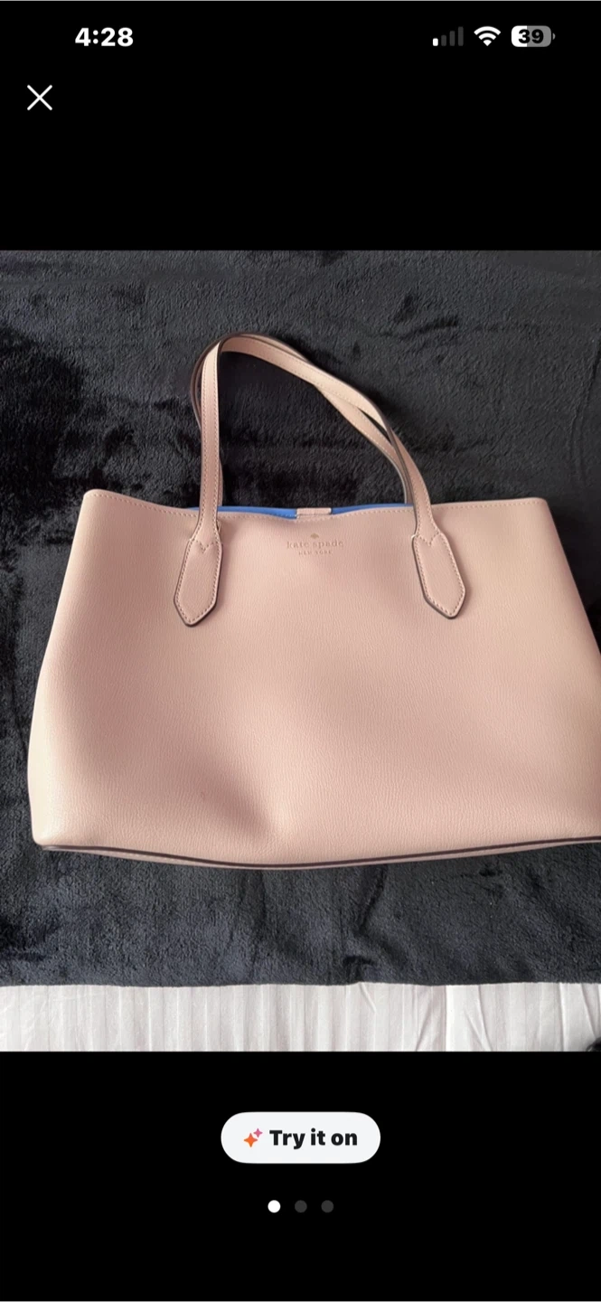 Selling a Kate Spade tote bag in a lovely light pink colour! It's in great condition and perfect for everyday use. The interior is a beautiful blue, adding a pop of colour to the bag. It's a stylish and practical accessory!