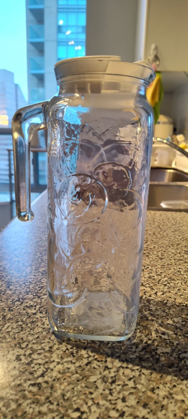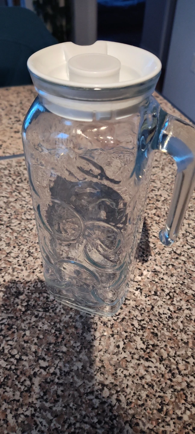Selling a lovely glass pitcher, perfect for serving drinks at your next gathering! It has a nice, sturdy handle and a lid to keep everything fresh. Great for water, juice, or even homemade iced tea!
