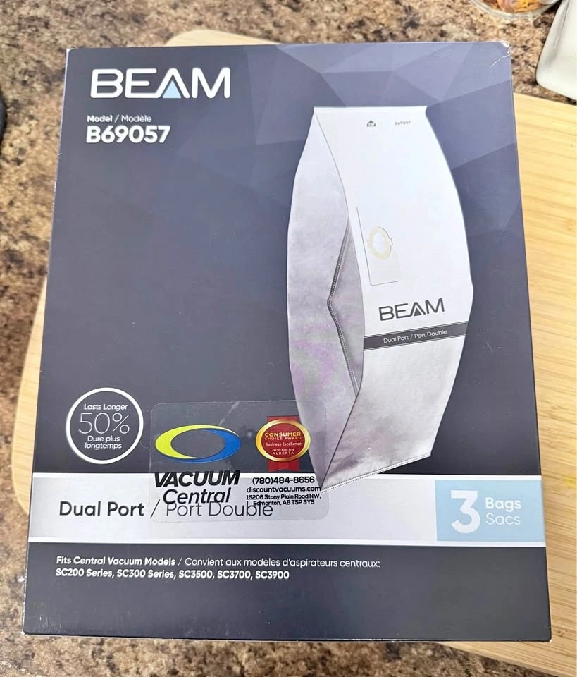 Brand New: BEAM Central Vac Bags Dual Port: Model B69057. Bought these before our central vac died, and of course our new one takes different bags. There 2 brand new bags left from this box of 3.