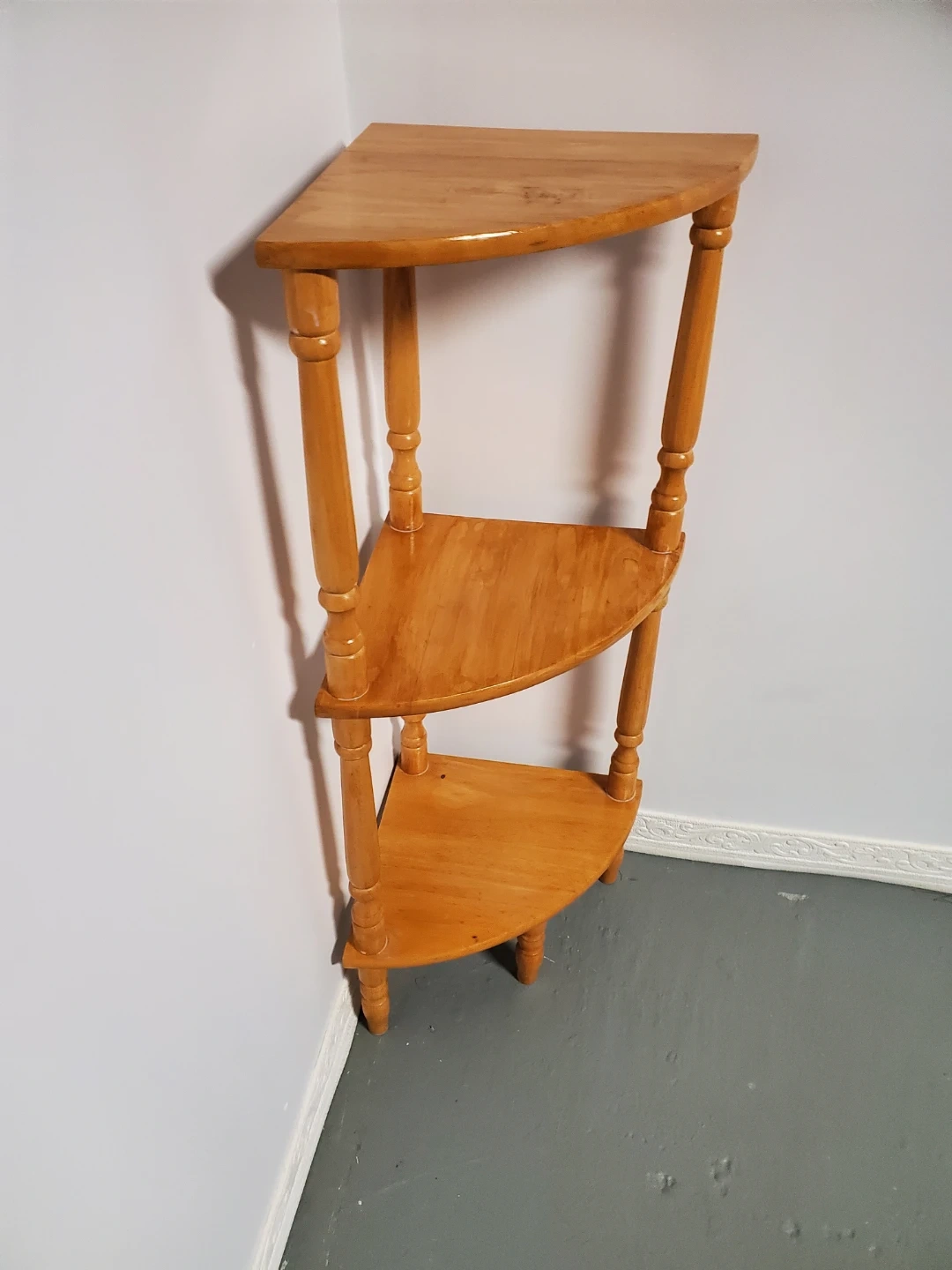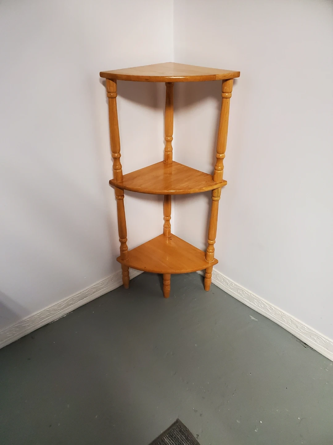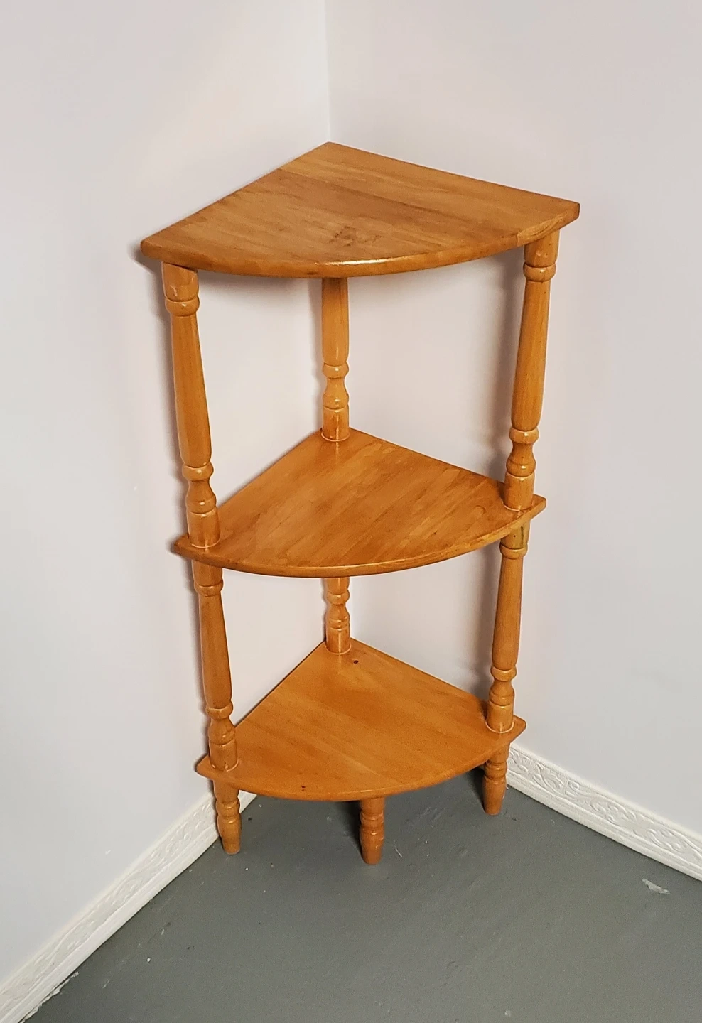 Here's a cute wooden corner shelf with three tiers! It's perfect for adding a bit of extra storage or display space to any corner.