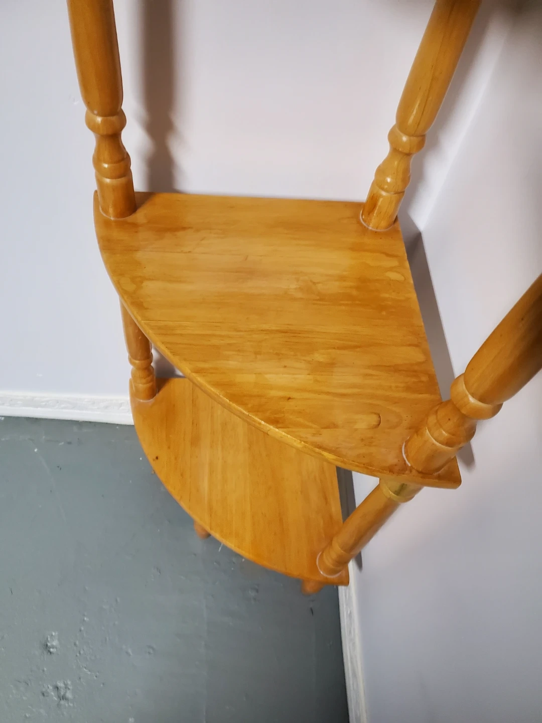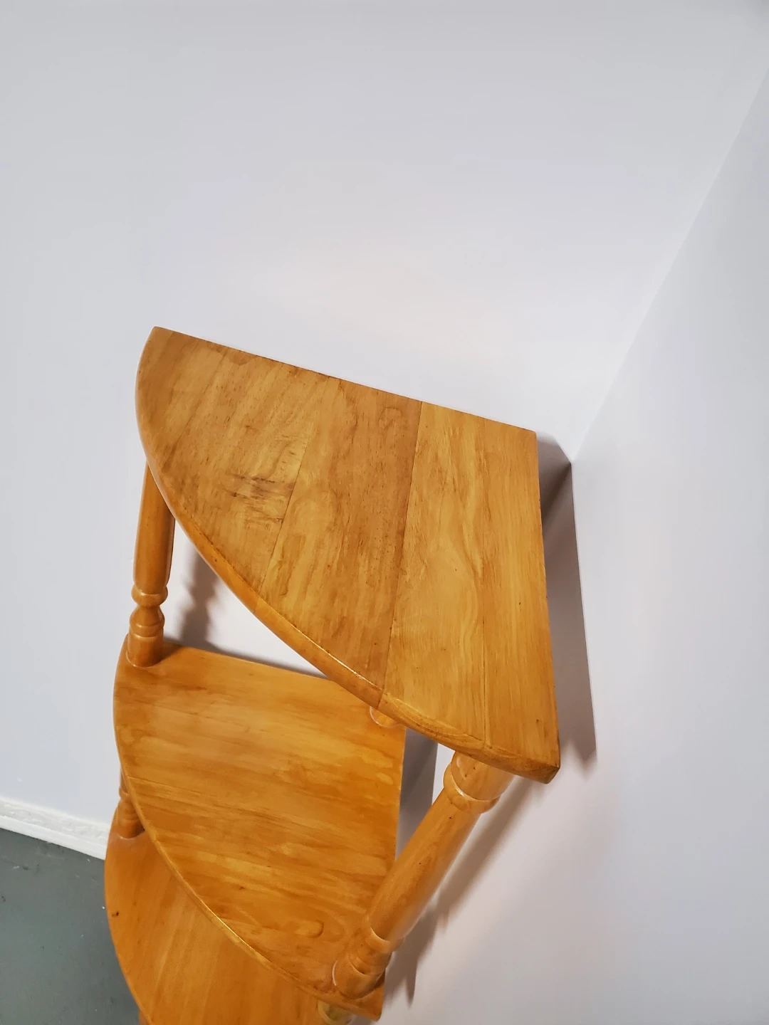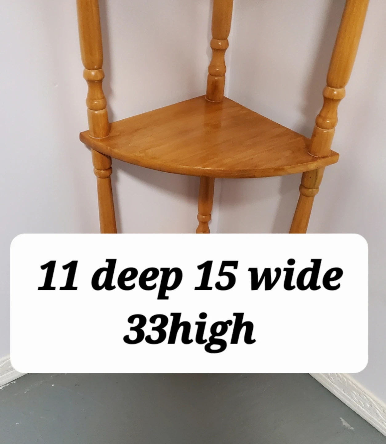 Here's a cute wooden corner shelf with three tiers! It's perfect for adding a bit of extra storage or display space to any corner.