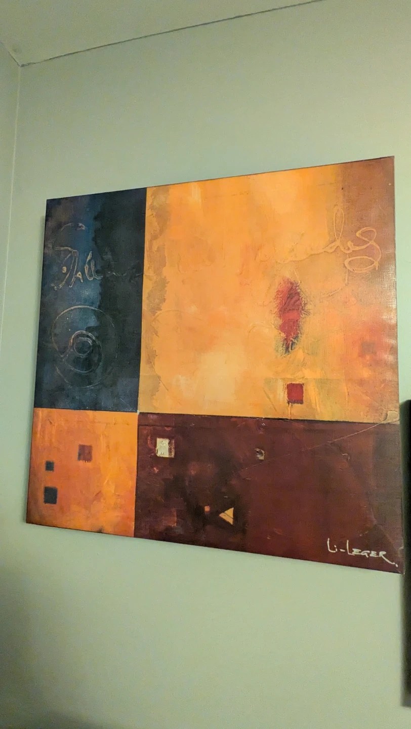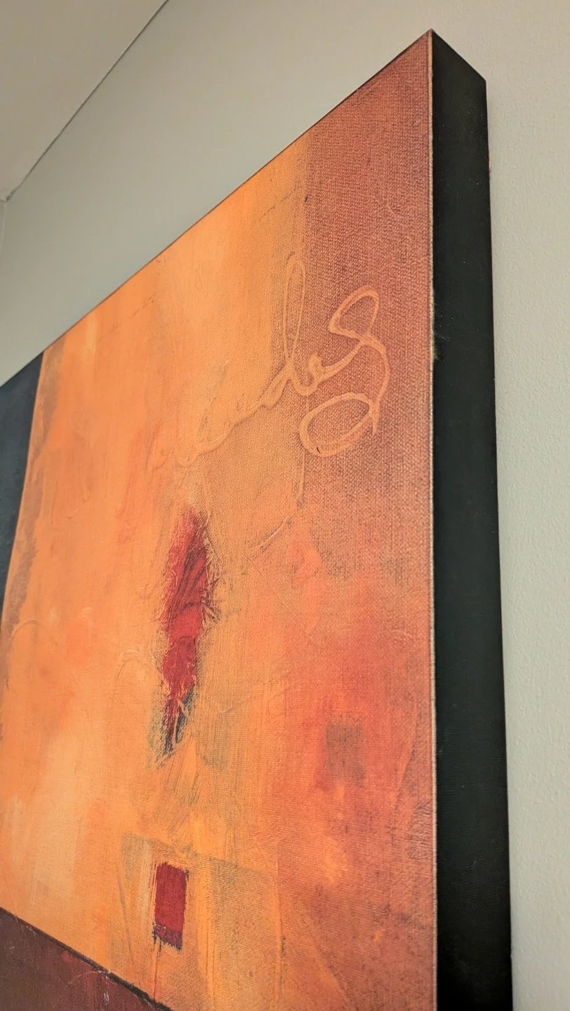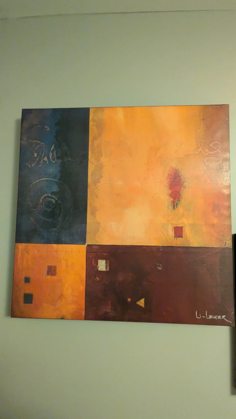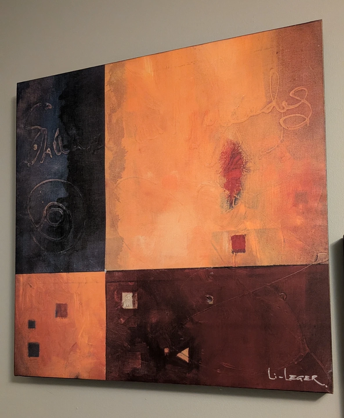 Unique abstract art canvas signed by Don Li-Leger. The painting features a mix of colours and geometric shapes, perfect for adding a touch of modern style to your home decor.