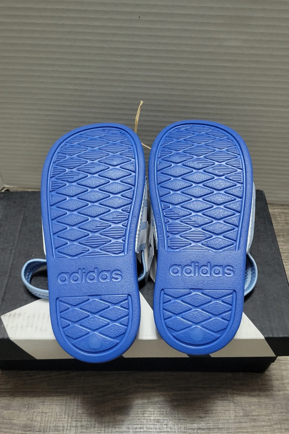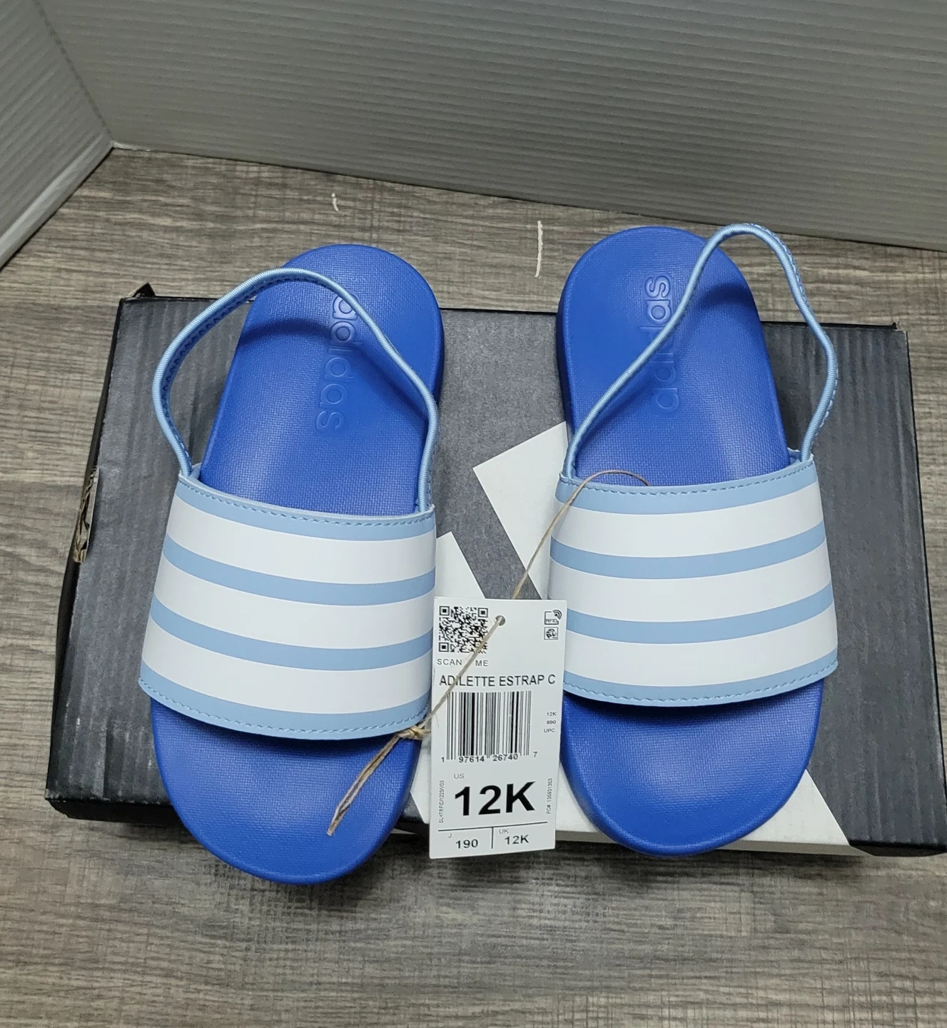 I'm selling a pair of brand new Adidas Adilette Strap C sandals in blue and white! They are size 12K and come with the original box