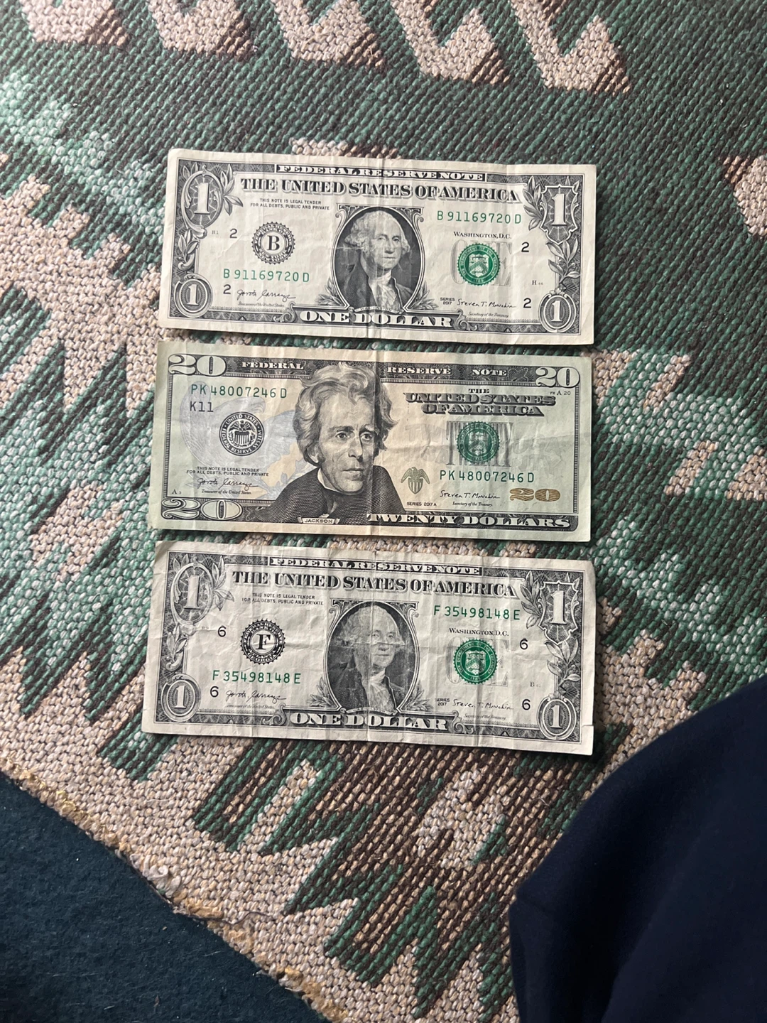 Selling a mix of US currency, including a twenty-dollar bill and two one-dollar bills. All are legal tender. Feel free to message if you're interested!