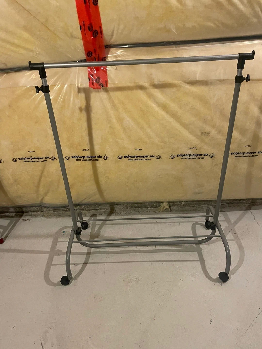 rolling clothes rack. ready to hold your clothes! The rack is grey and has wheels for easy movement. Perfect for adding extra storage to your closet or laundry room