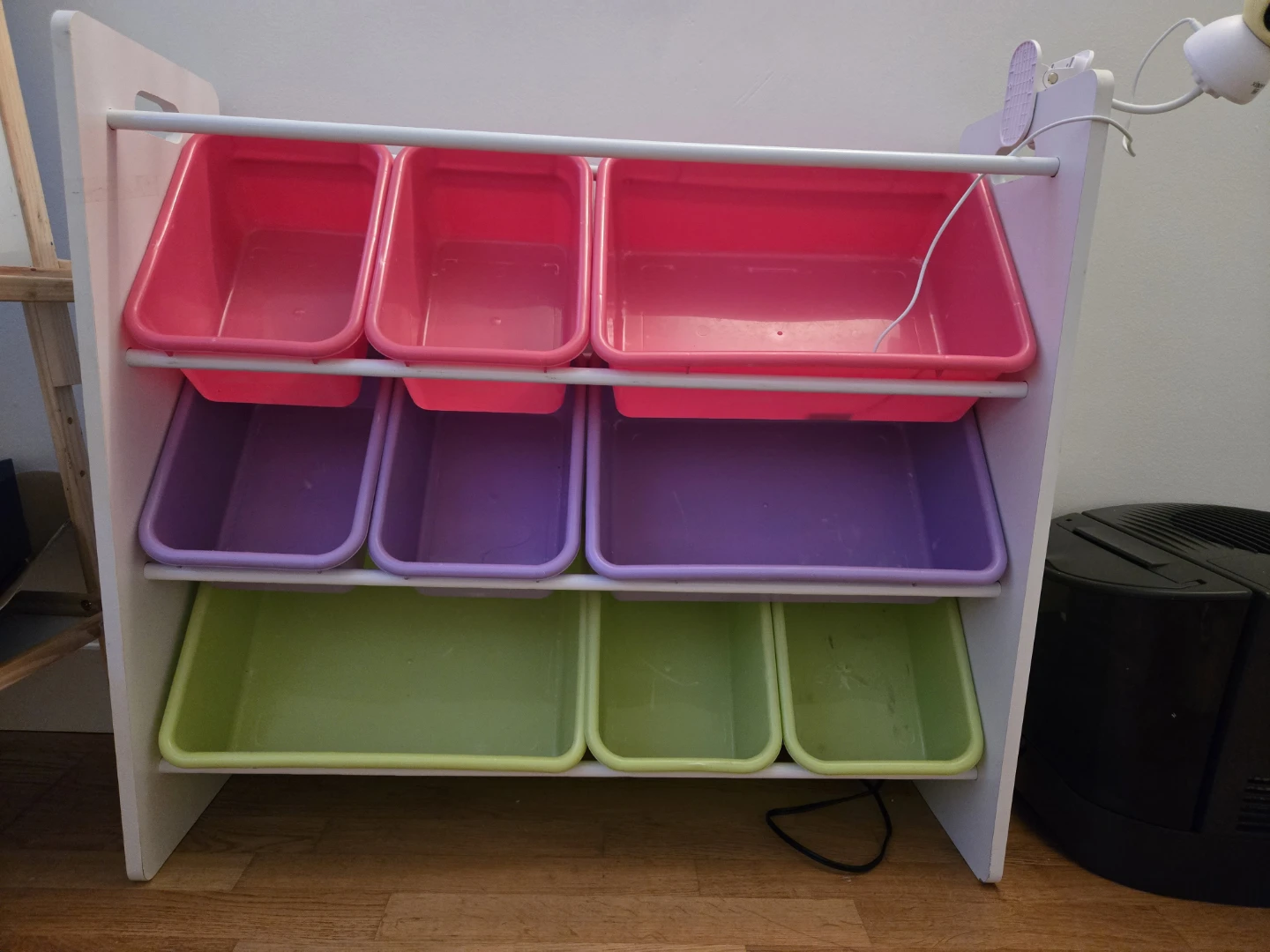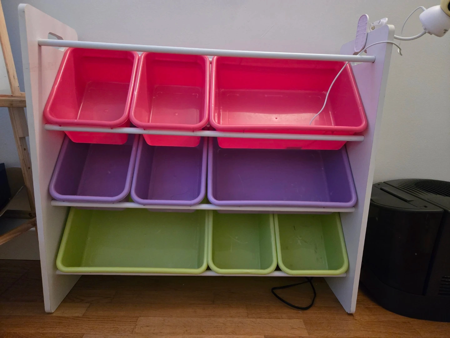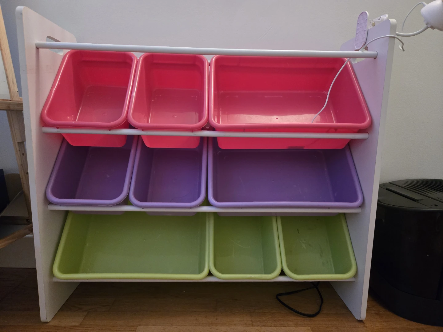 Declutter your kids' play area with this handy toy storage organizer! It comes with multiple bins in pink, purple, and green, making it easy to sort and store toys, books, and more. Perfect for keeping things tidy and accessible for your little ones