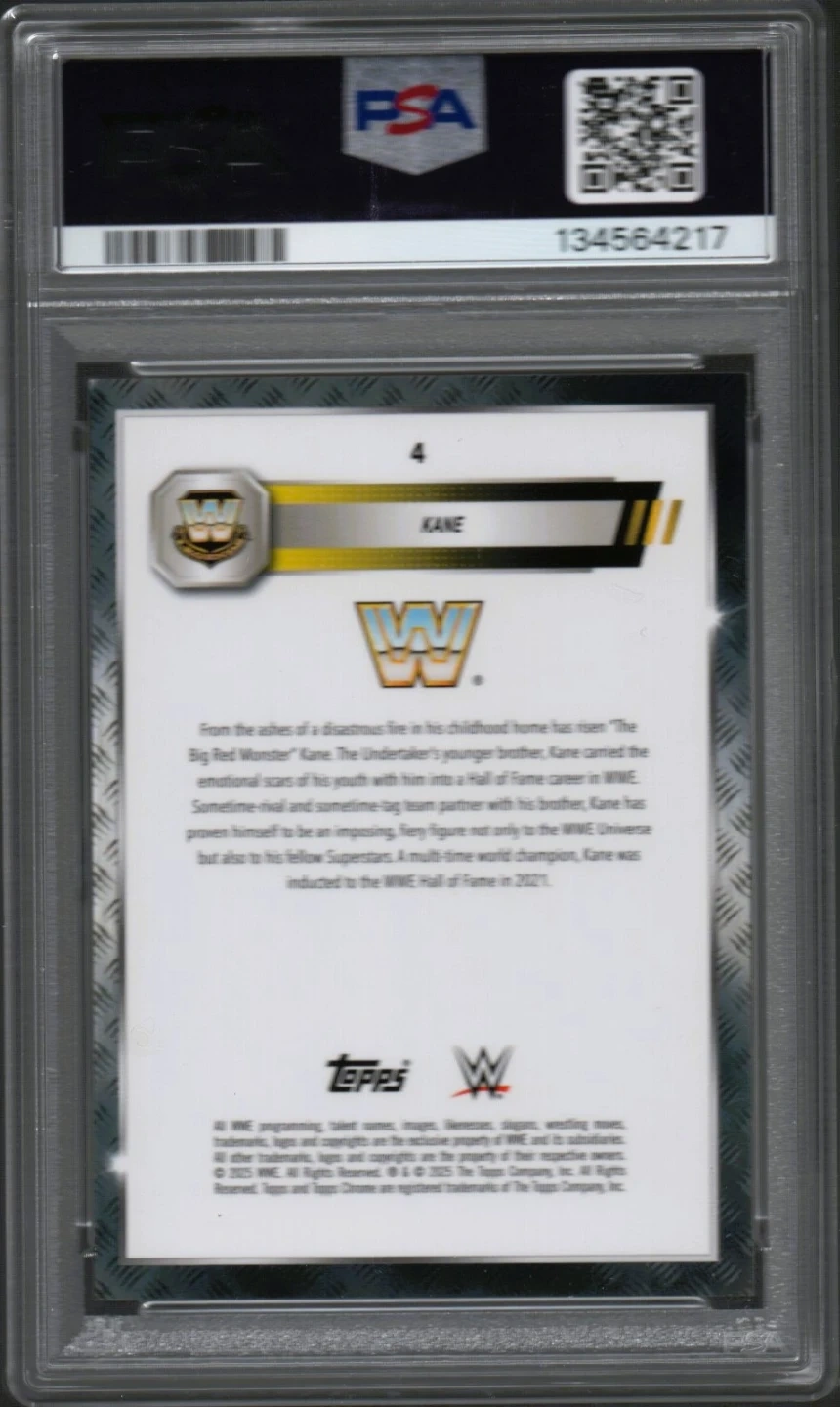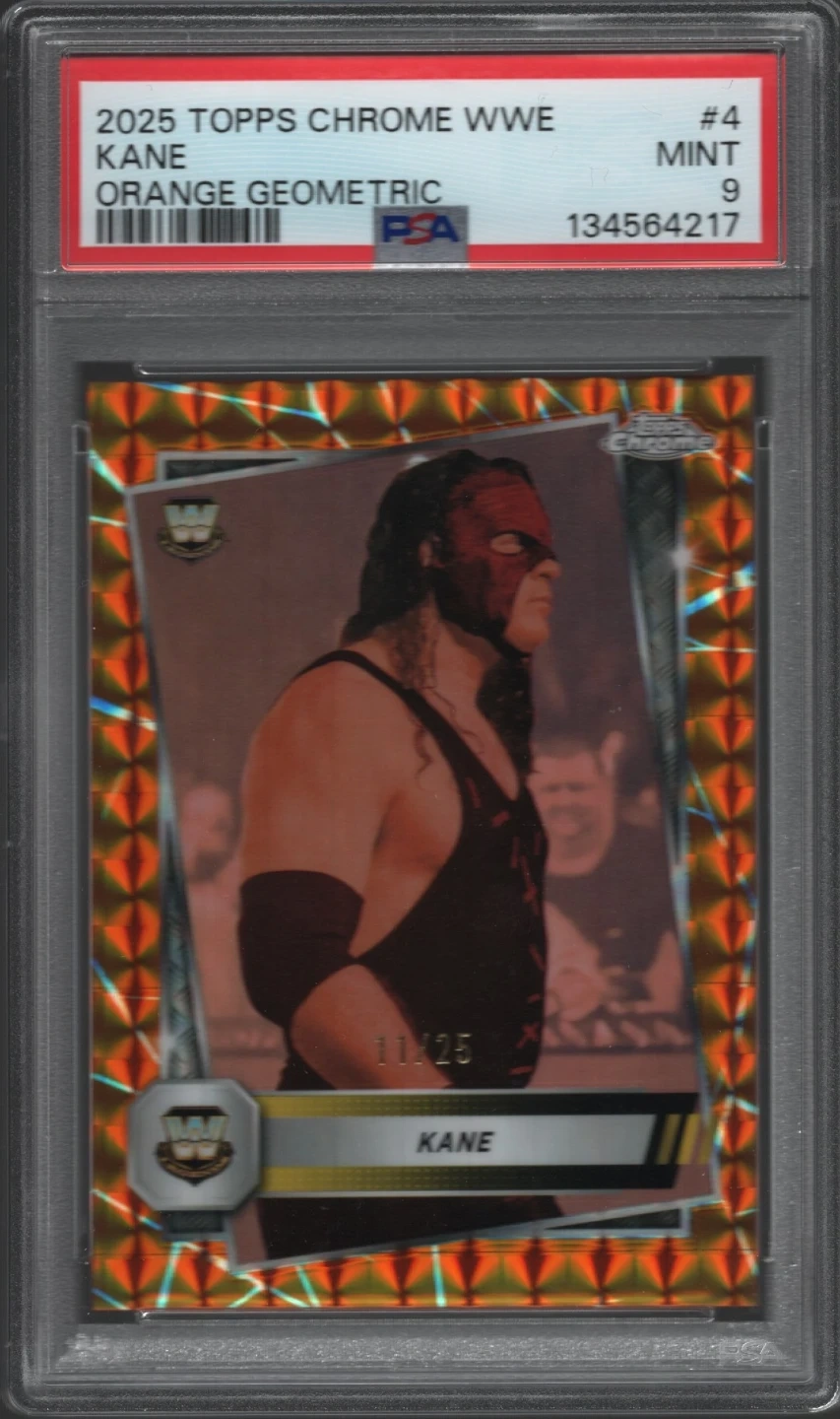Selling a 2025 Topps Chrome WWE card featuring Kane. It's an Orange Geometric card, graded Mint 9 by PSA. A great addition for any WWE fan or card collector!