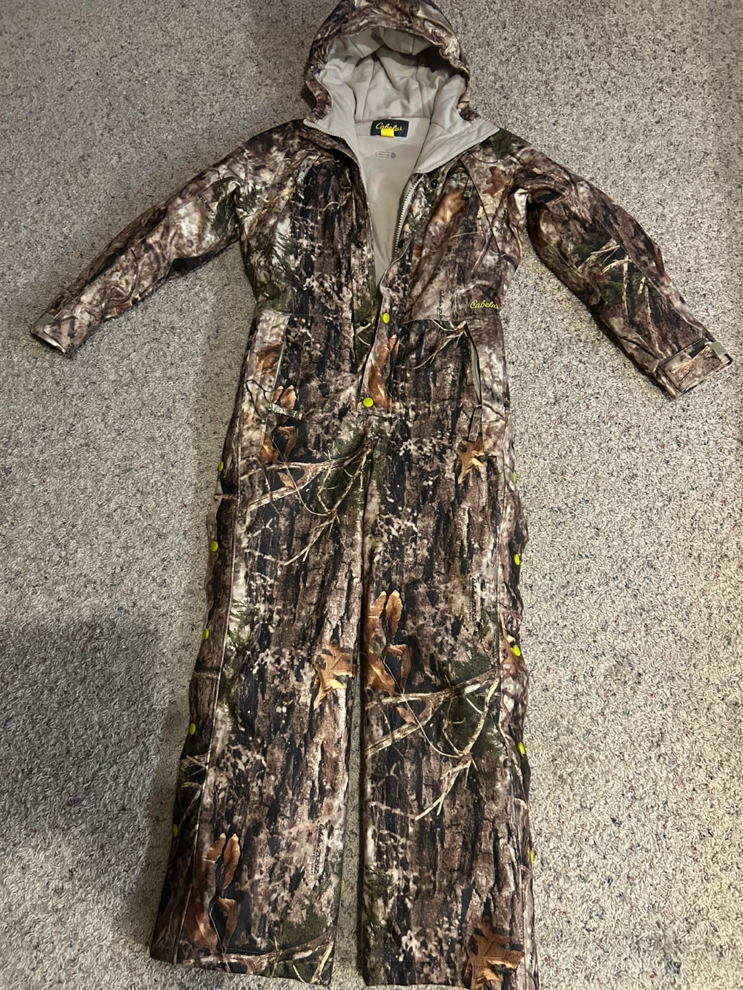 Selling a Cabela's insulated coverall in a camo pattern. Perfect for staying warm and concealed during outdoor activities!