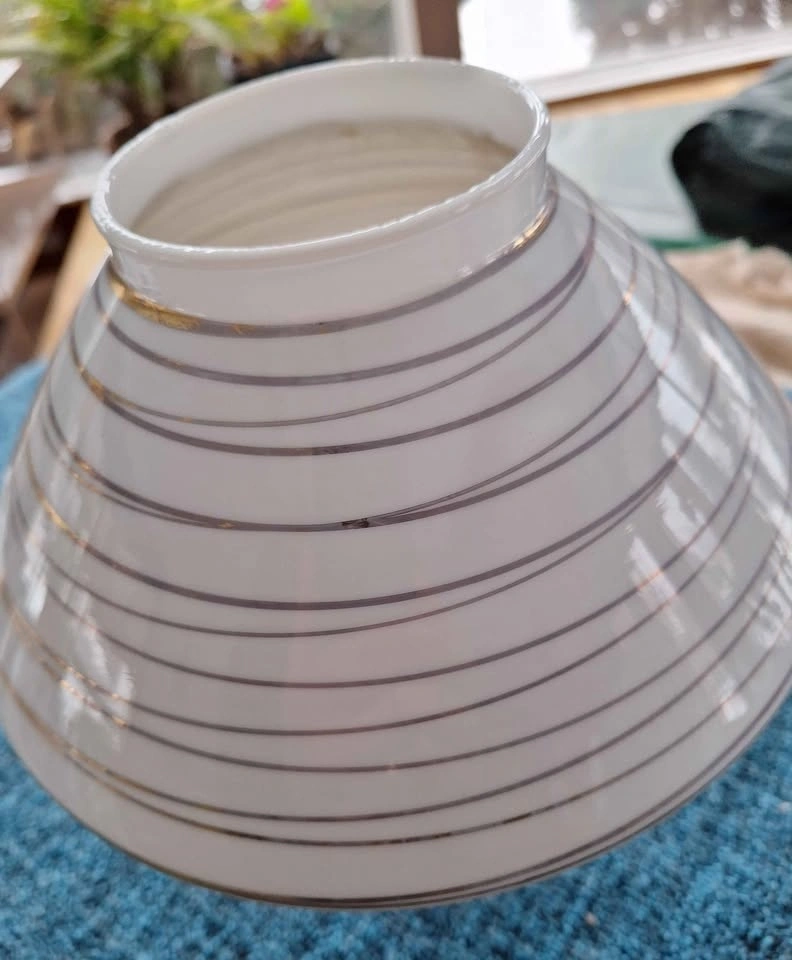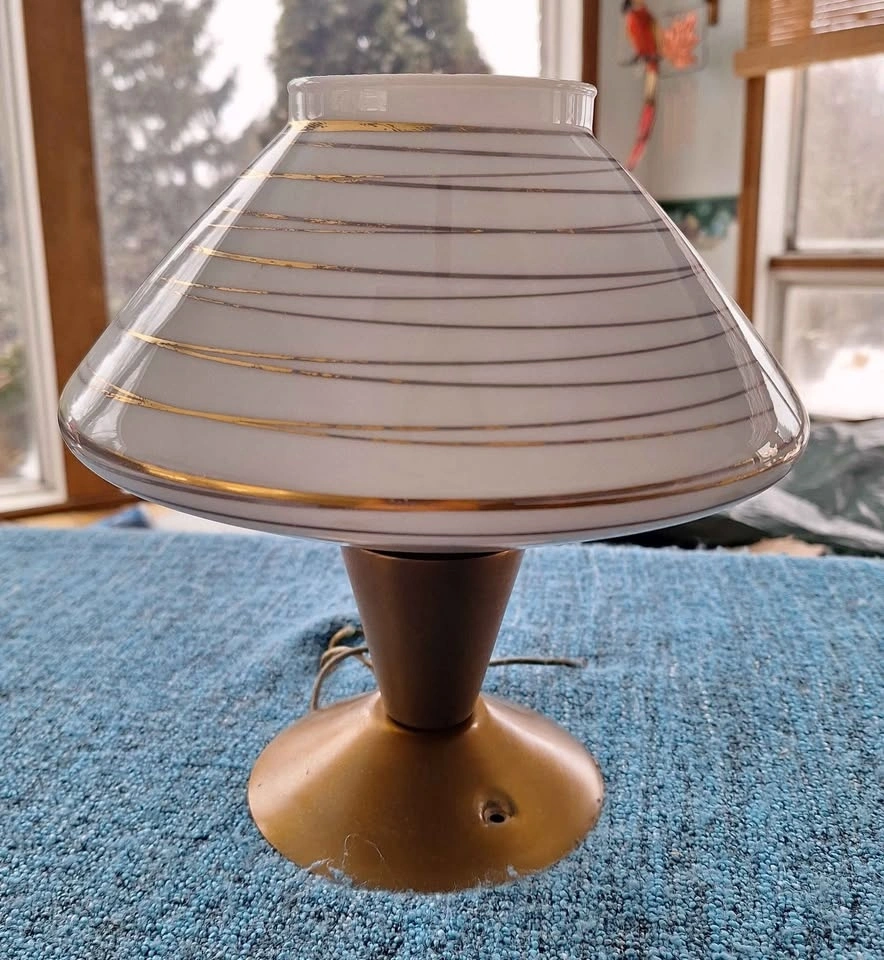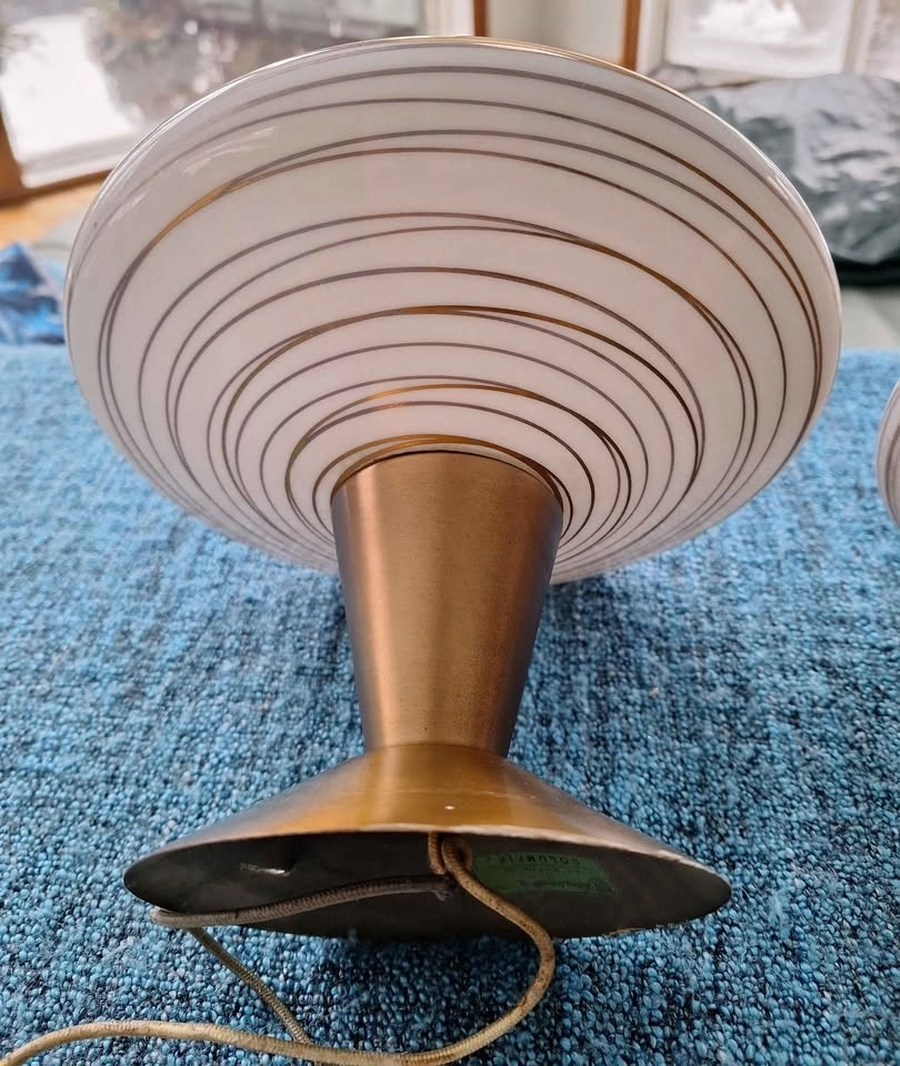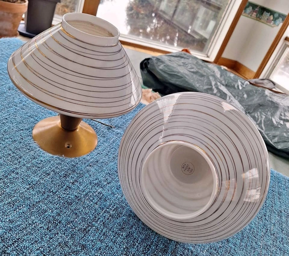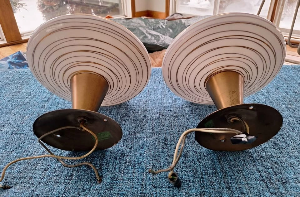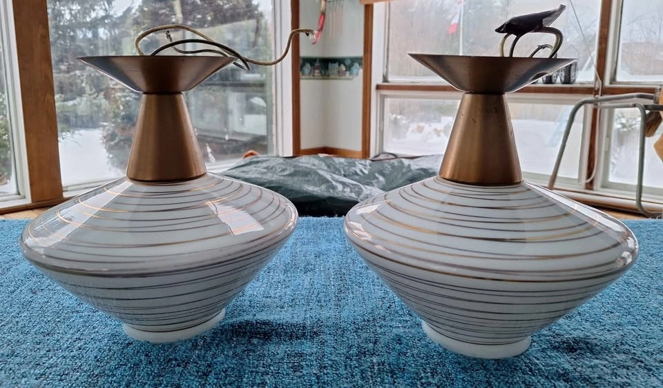 Flush mount white glass ceiling lights with gold tone swirl accents from 1960's. Selling as a pair, work perfectly and measure 9" long and 9.5" at widest point.
