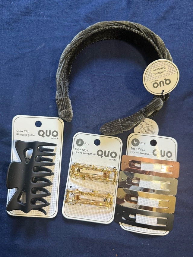 Elevate your hair game with this stylish collection of Quo hair accessories. Included is a chic grey braided headband, a sleek black claw clip, two elegant gold salon clips, and four trendy snap clips in various metallic shades. All items are new with tags. These accessories are perfect for adding a touch of flair to any hairstyle!