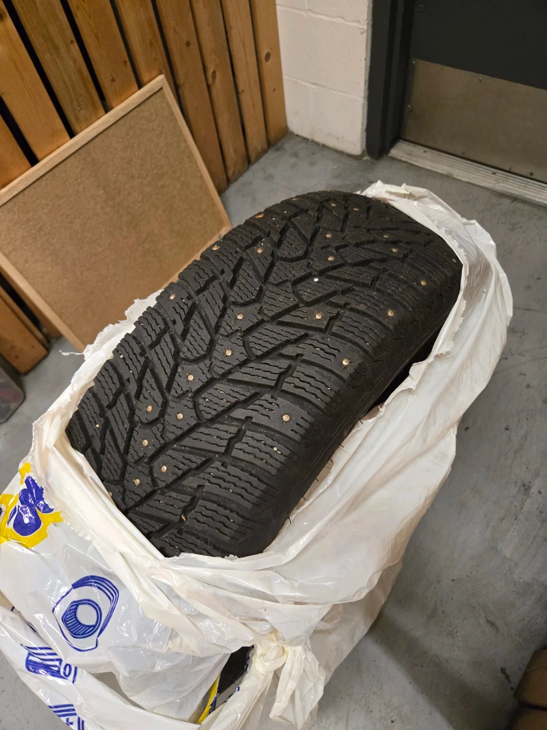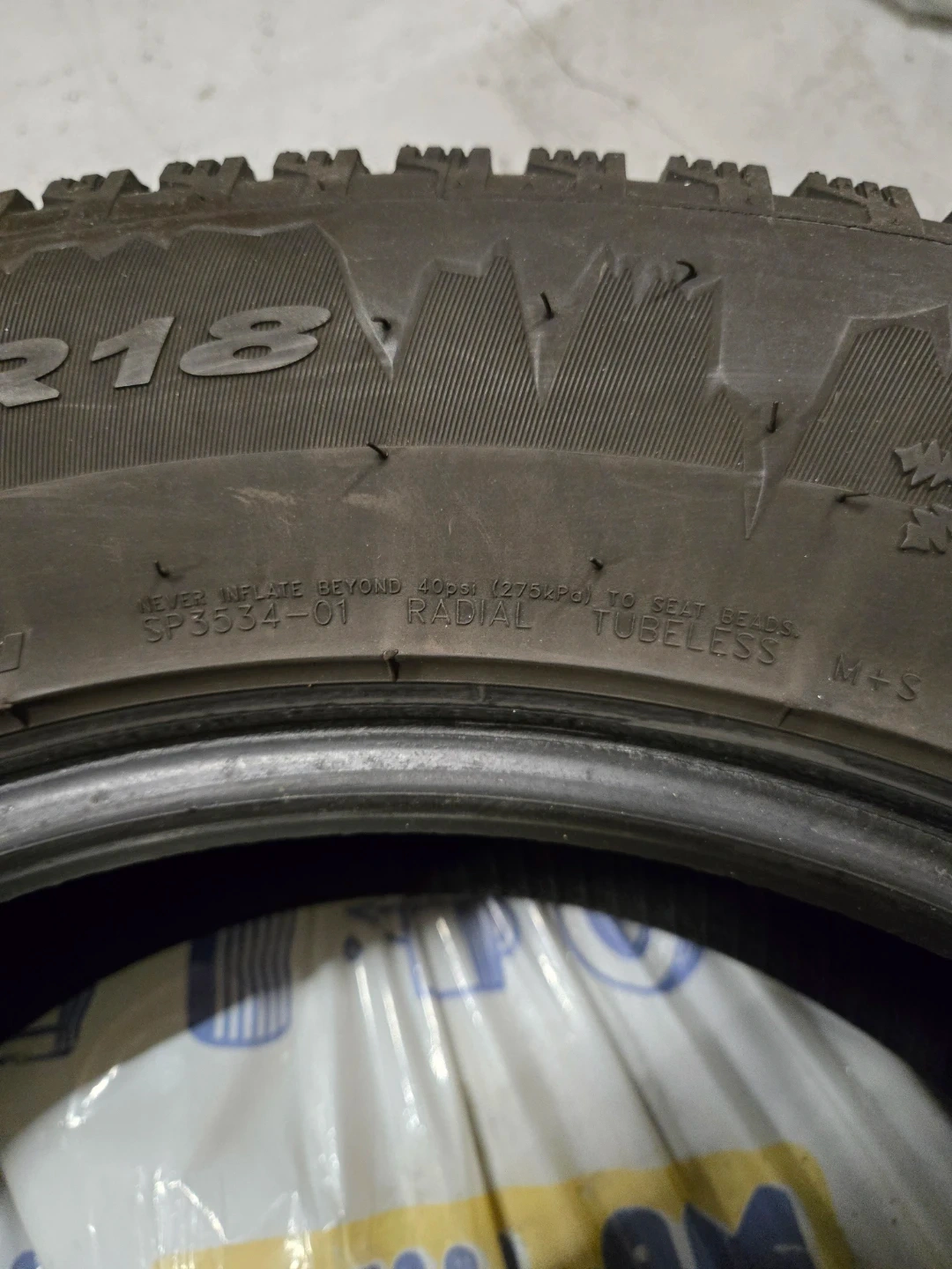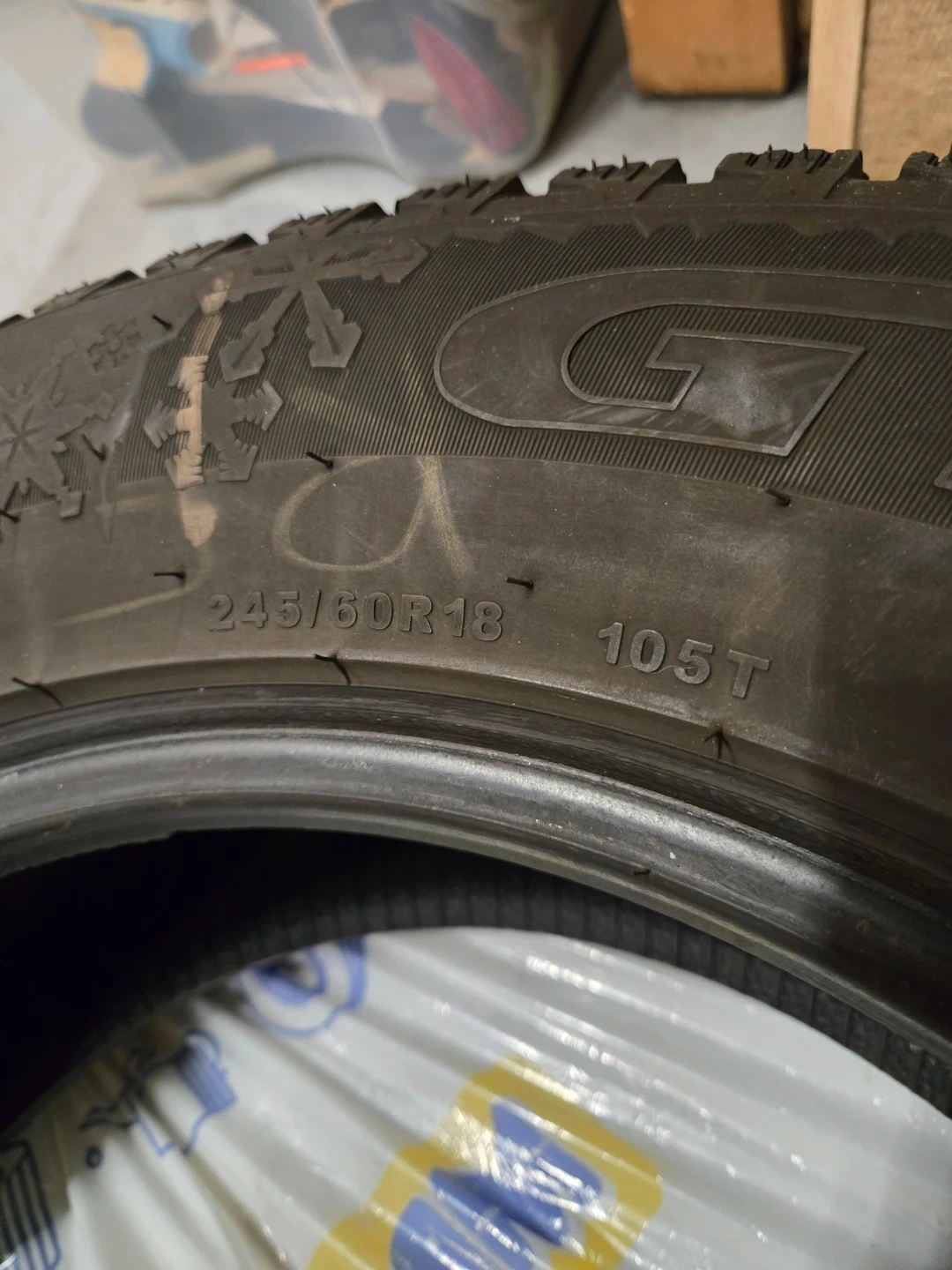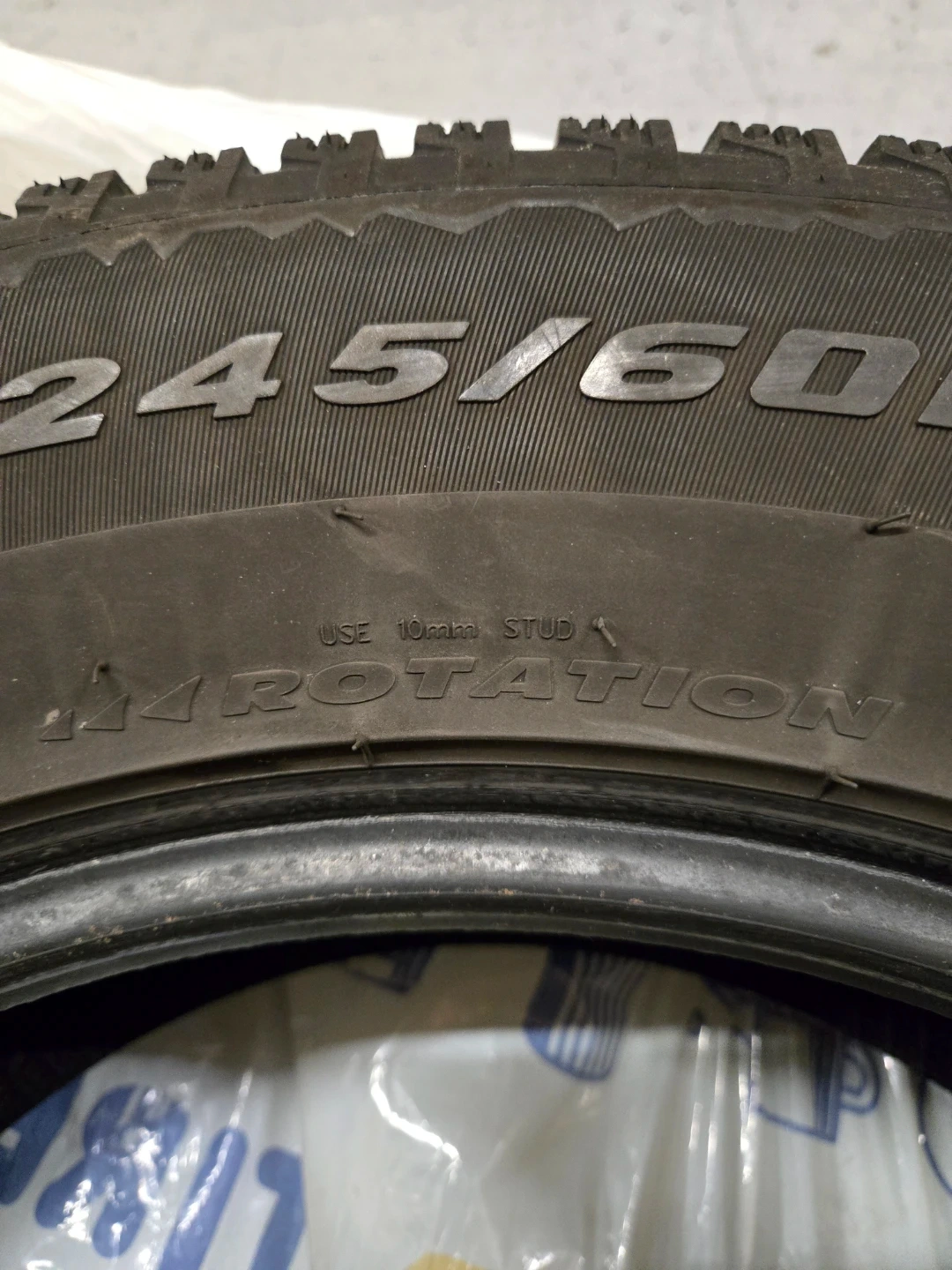 Selling a studded winter tire in size 245/60R18. It's ready to provide excellent traction in snowy and icy conditions. The tire is marked with 'M+S' indicating its suitability for mud and snow. It also has 'USE 10mm STUD'.