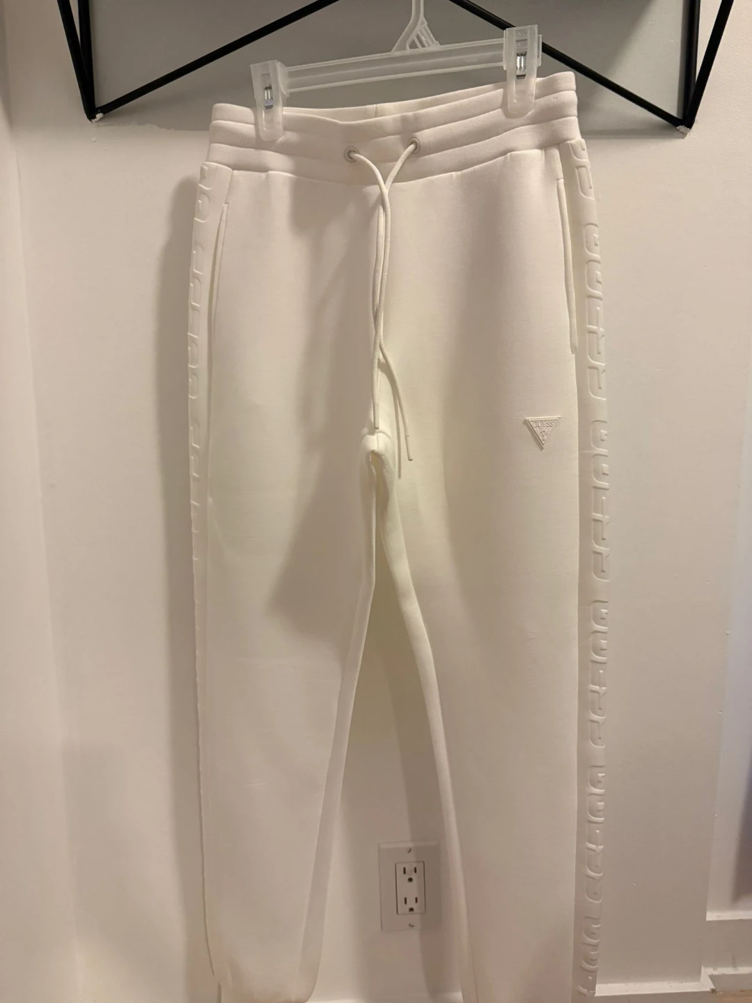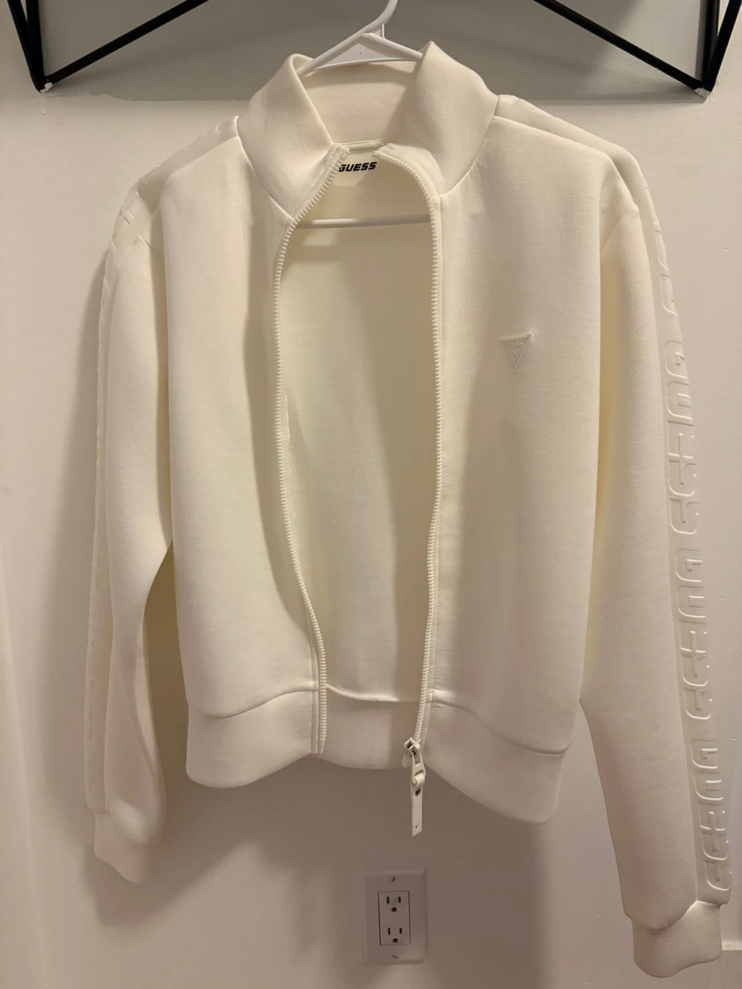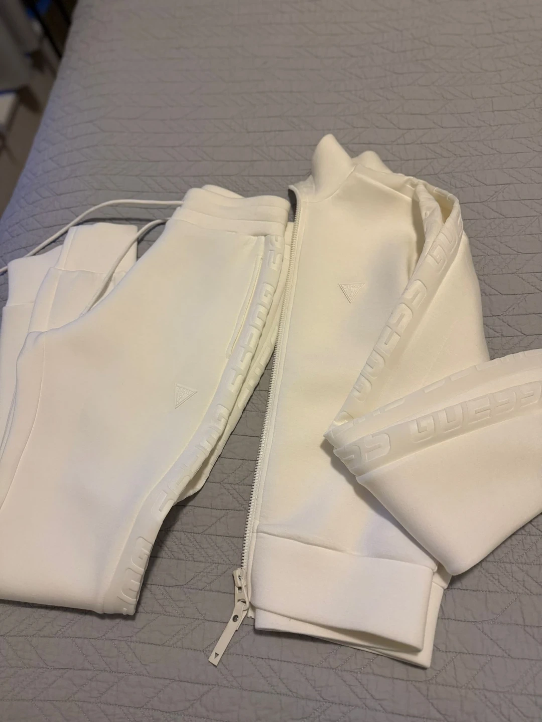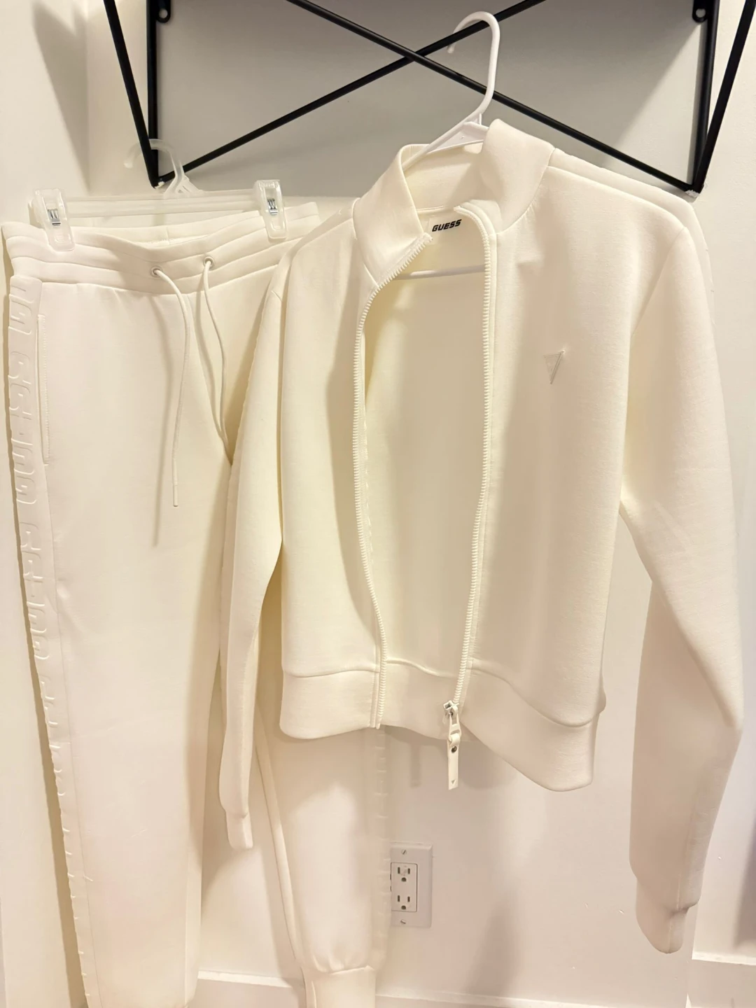Selling a Guess white tracksuit, including both the jacket and pants! The set features the Guess logo and lettering. Great for a stylish and comfortable look