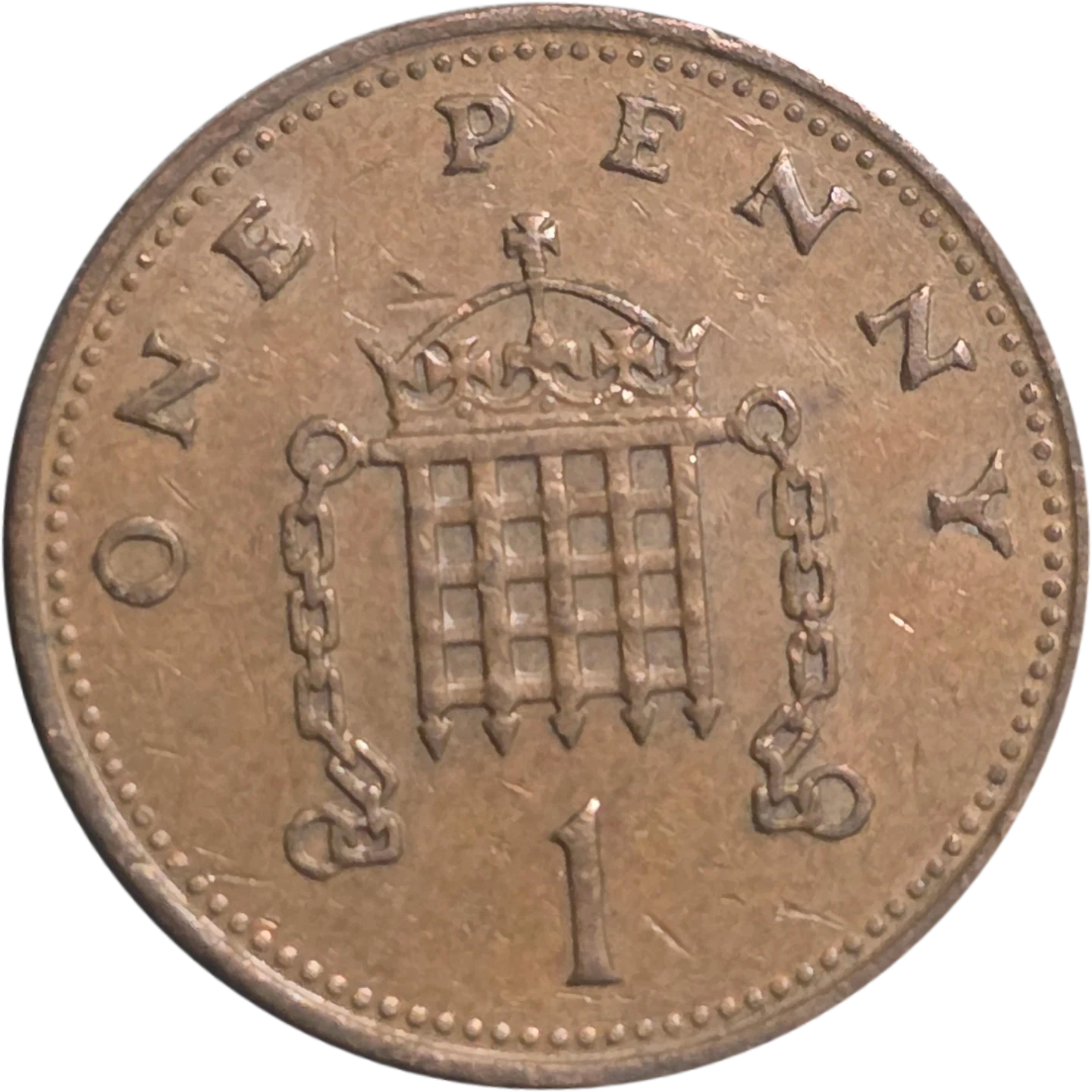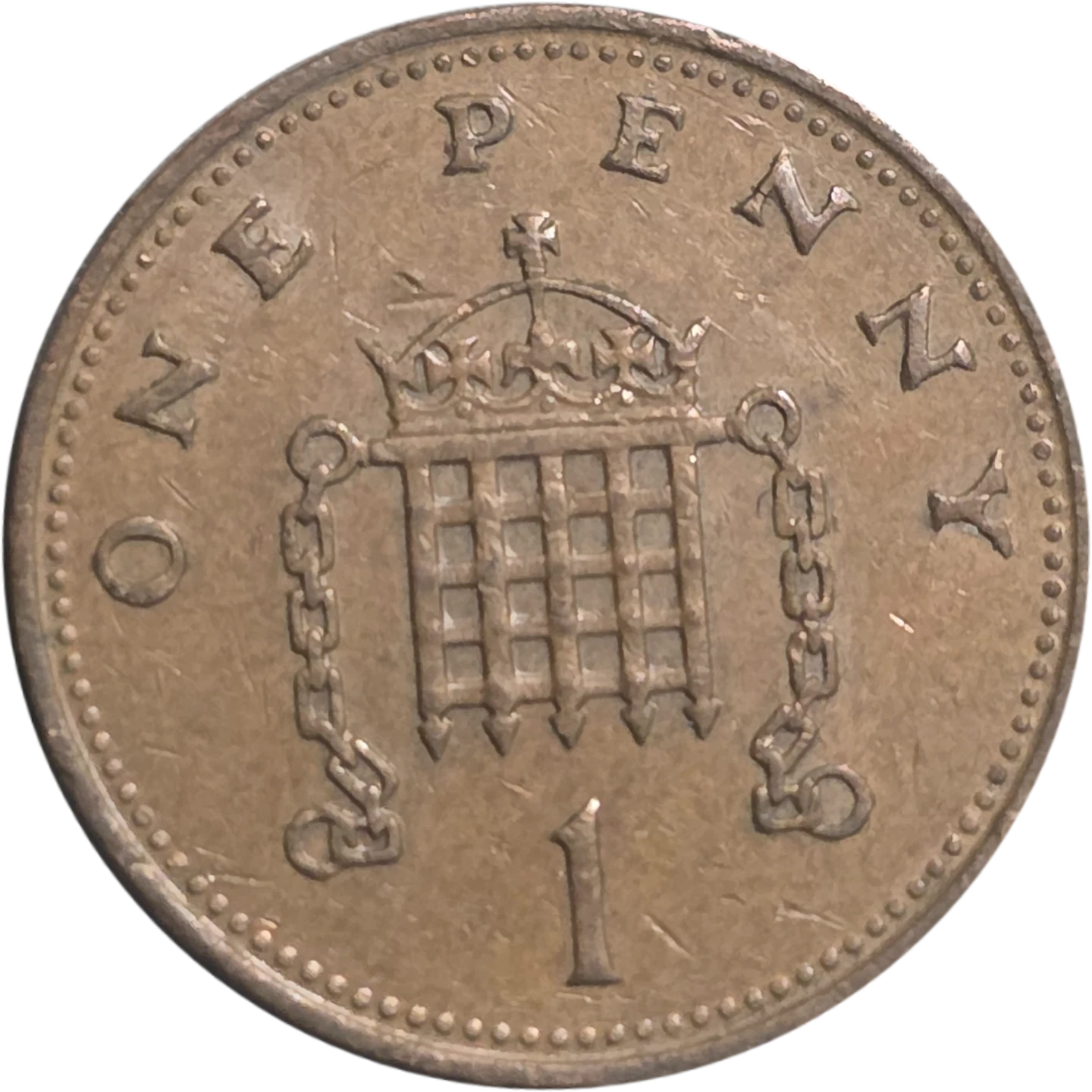 This is a British one penny coin featuring the Royal Portcullis with chains, a design used from 1985 to 1992.
