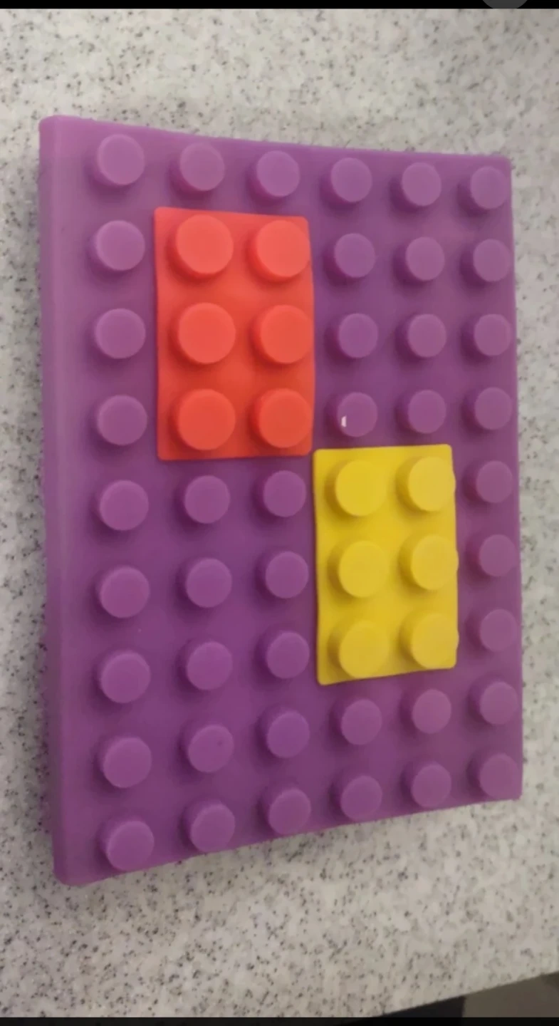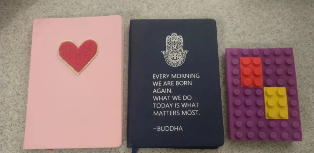 Selling three notebooks. One is blue with a hand design, one is pink with a heart, and the last one is purple with lego pieces