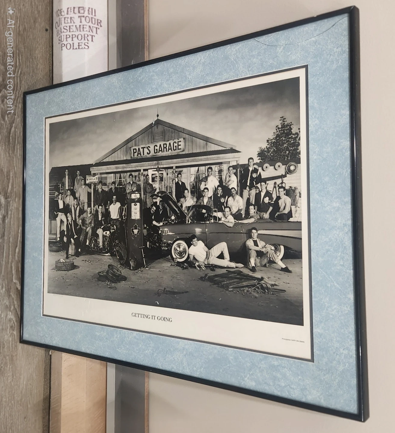 Framed print featuring a black and white photo titled "Getting It Going" and the text "Pat's Garage". The frame is light blue with a darker blue edge.