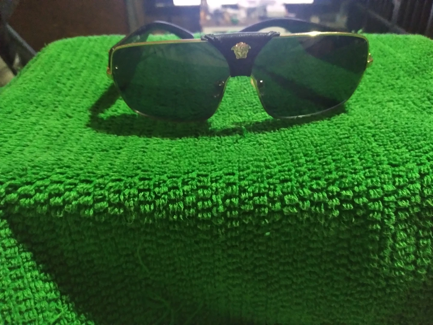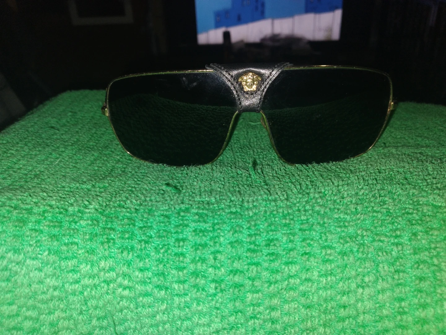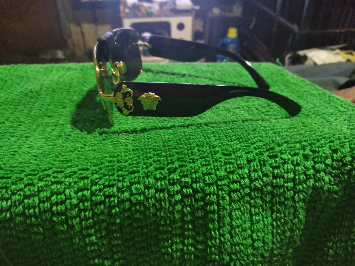 Selling a pair of Versace sunglasses. They have a gold frame and the Versace logo on the side. Stylish and in great condition!