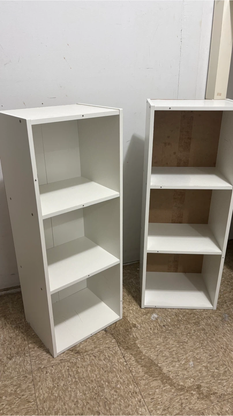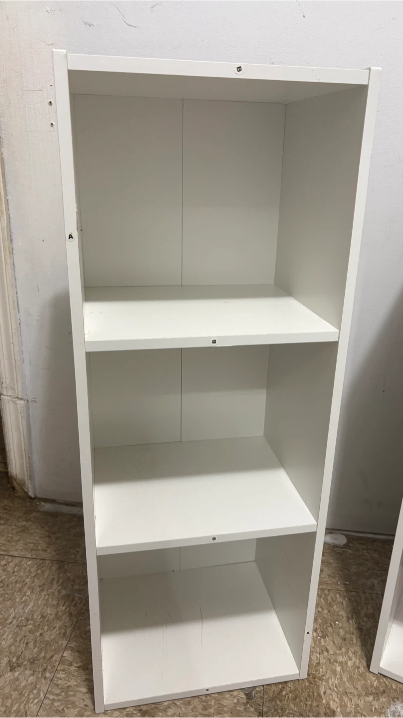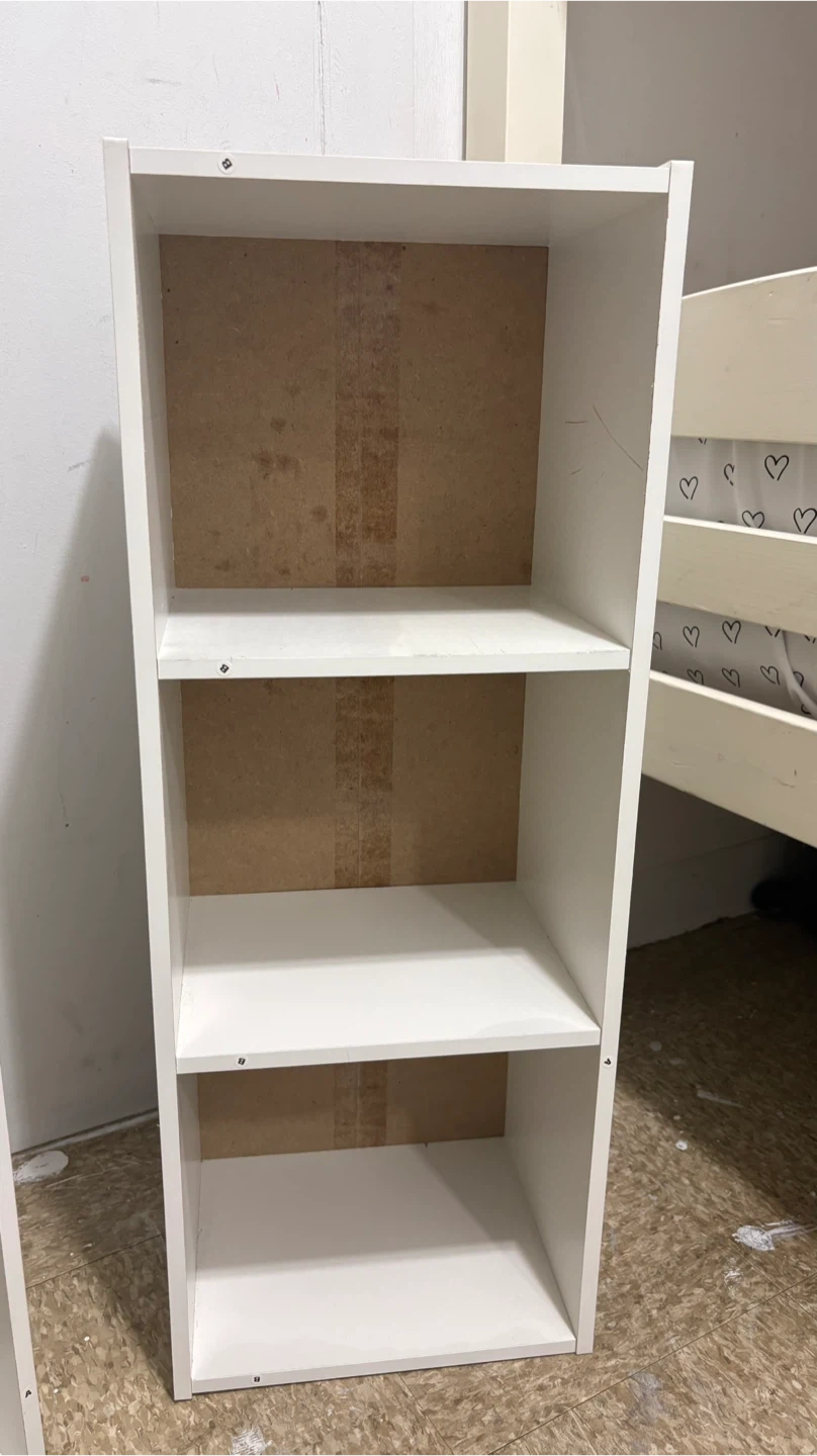 Selling a simple white bookshelf. It has three shelves and is perfect for storing books, toys, or other items. It's in good condition and ready for a new home