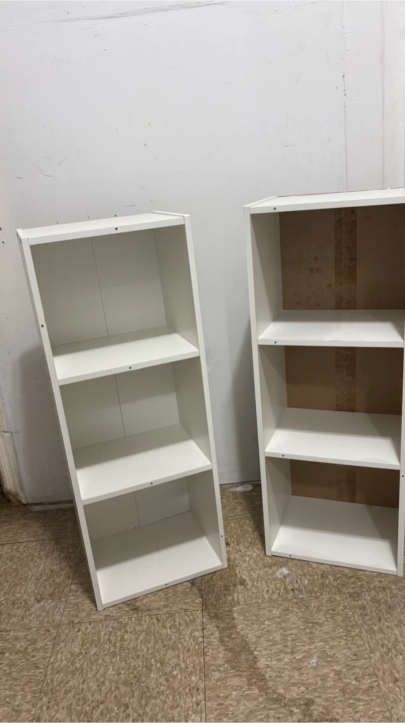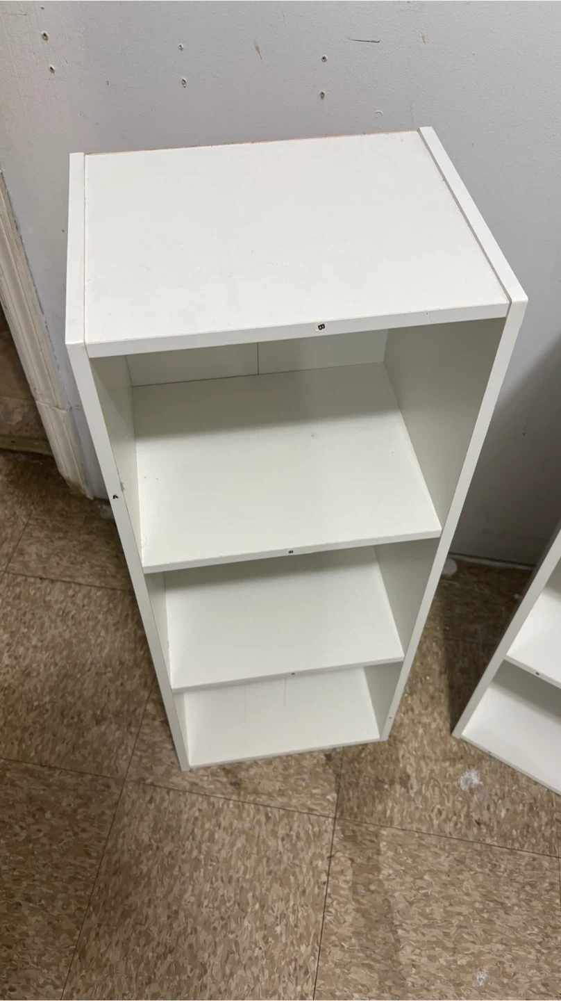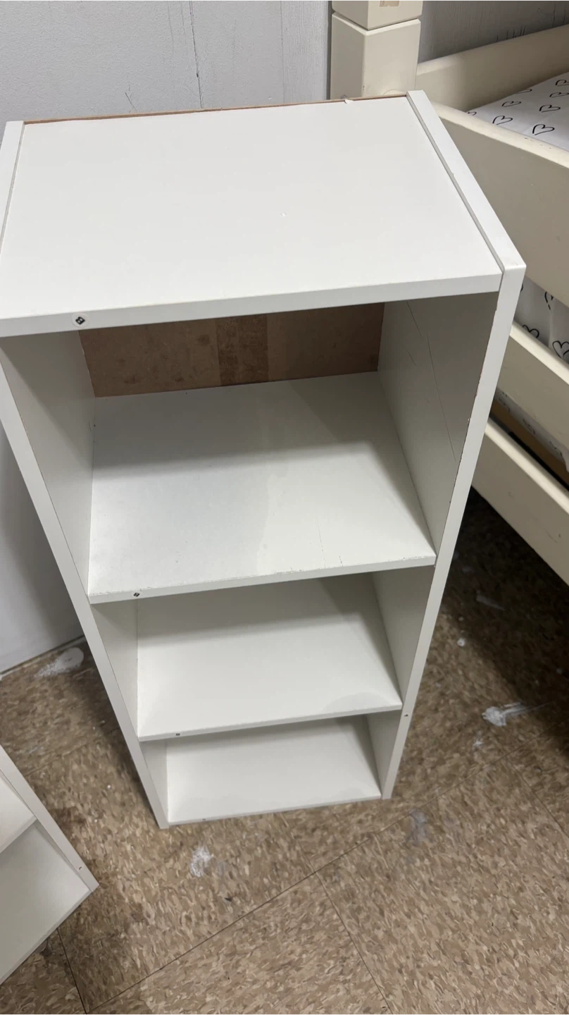 Selling a simple white bookshelf. It has three shelves and is perfect for storing books, toys, or other items. It's in good condition and ready for a new home