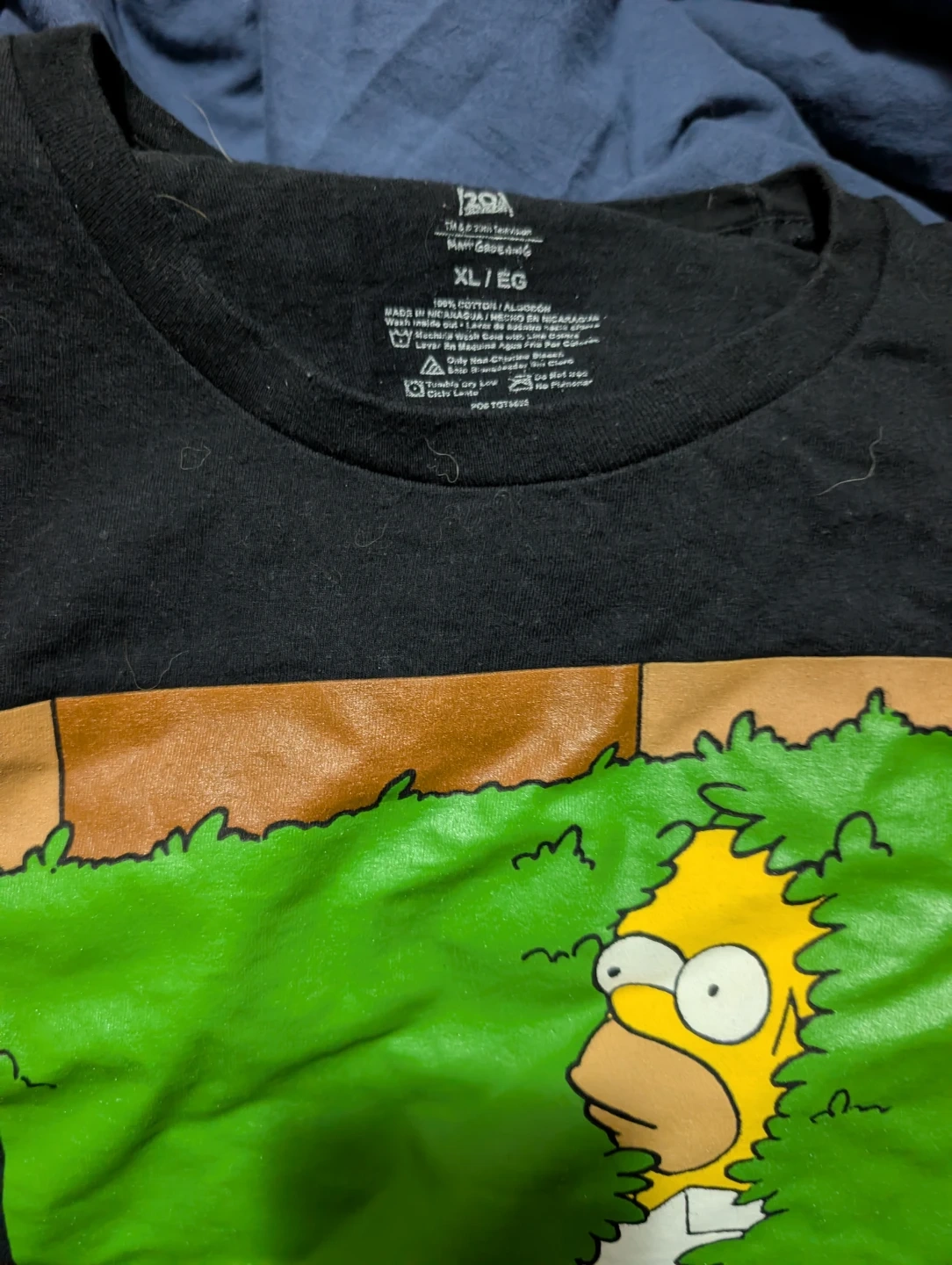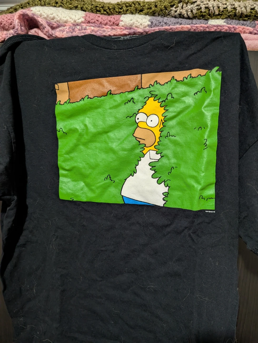 Selling a gently used Simpsons t-shirt featuring Homer Simpson peeking through the bushes! It's a size XL and made of 100% cotton. Barely worn. Will lint roll it for you!